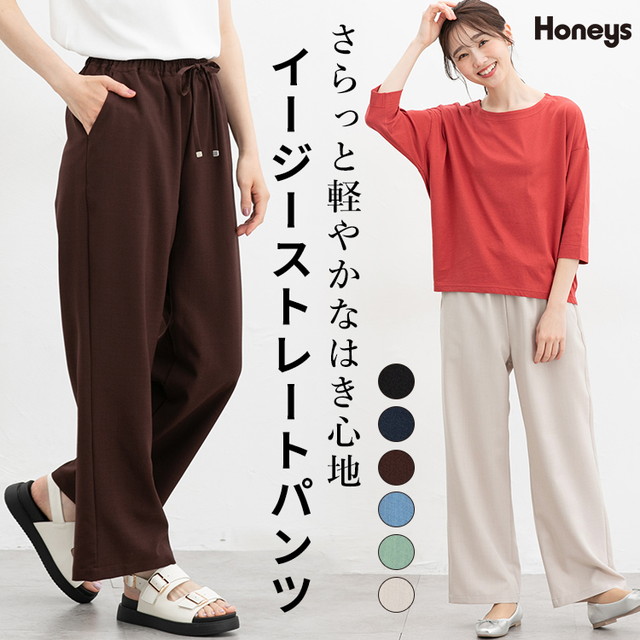 ボトムス パンツ イージーパンツ ストレートパンツ 麻調素材 無地 ウエストゴム ベーシックカラー レディース SALE セール Honeys ハニーズ イージーストレートパンツ