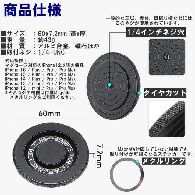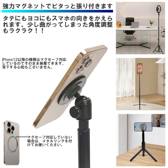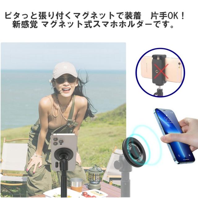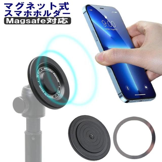 三脚用スマホホルダー magsafe 三脚マウント マグネット式 スマホホルダー スマホスタンド 雲台 1/4ネジ穴 iphone 超強力磁力 三脚 スタンド アタッチメント 磁気 360度回転 一脚用アダプター 軽量 自撮り棒 スマホ リング コンパクト 角度調整 送料無料
