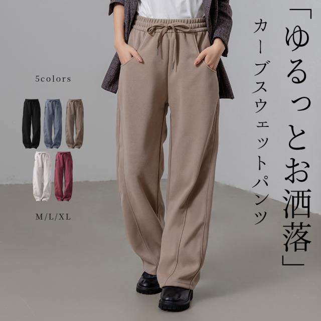冬新作 「おじコーデへの一歩」スウェット パンツ カーブパンツ レディース ボトムス ロングパンツ きれいめ ゆったり シルエット イージーパンツ ストレート 切り替え ライン ポケット ウエストゴム ひも調節 着痩せ 中厚手 無地 黒 秋冬