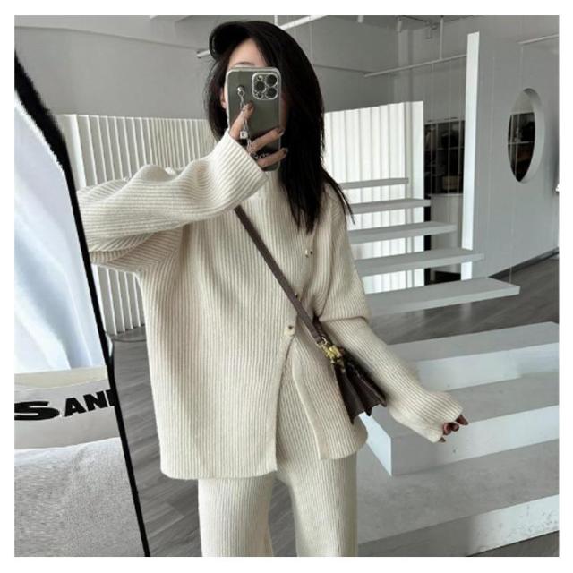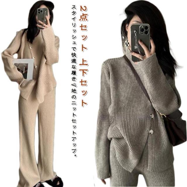 ニット セットアップ プルオーバー ドロップショルダー サイドスリット アシンメトリー ニットセット 2点セット 上下セット ワイドパンツ リブニット フレアパンツ ロングパンツ カジュアル 通勤 OL 体型カバー 着痩せ ブラック ベージュ アイボリー グレー