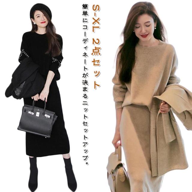 ニットセットアップ レディース カジュアル セットアップ スカートスーツ ニットセーター 長袖 ニット セーター スカート セットアップ 無地 ロング丈 オシャレ 上品 韓国風 カジュアル 2点セット オフィス ベージュ ブラック パープル