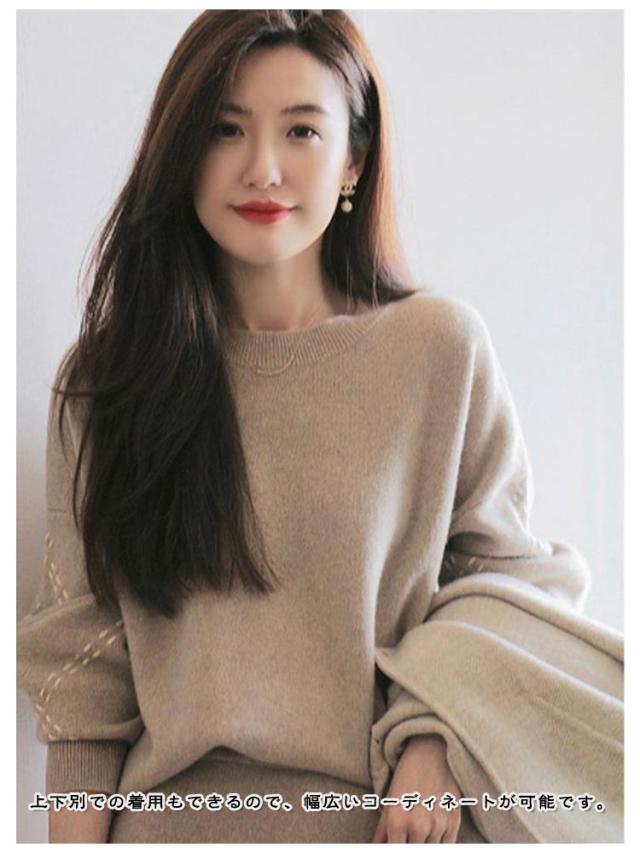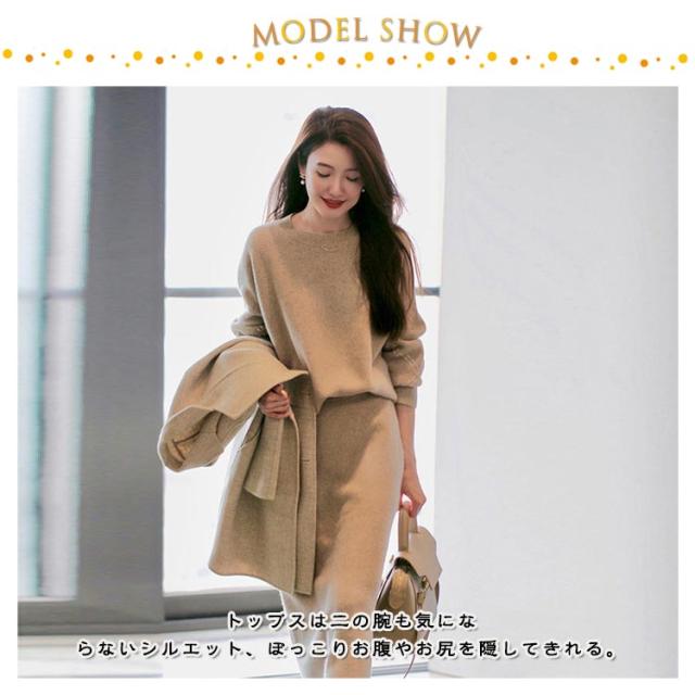 | 簡単にコーディネートが決まるニットセットアップ。 トップスは二の腕も気にならないシルエット、ぽっこりお腹やお尻を隠してきれる。 スカートはワイドリブで縦のラインをすっきりと見せてくれます。 上下別での着用もできるので、幅広いコーディネートが可能です。 きめ細やかなハイゲージニット素材でエレガンスなドレープ感も叶うアイテムです。 生地の質感も肌触りの良い素材で大好評頂いております。 | |