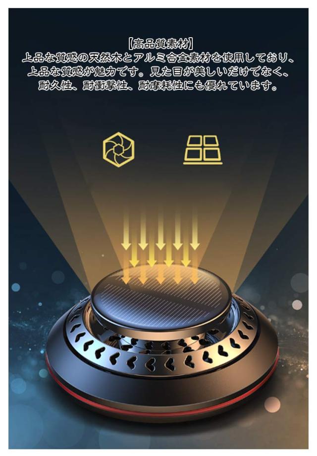 | 【車用芳香剤】 セット内容:本体、オーデコロンエッセンシャルオイル*1、香り木*1 【高品質素材】上品な質感の天然木とアルミ合金素材を使用しており、上品な質感が魅力です。見た目が美しいだけでなく、耐久性、耐衝撃性、耐摩耗性にも優れています。 【ソーラー回転式】充電は不要、太陽光に当たると回転する、環境にやさしい。香りの拡散スビートを自動的調整します。 コンパクトなデザイン、車の視線を遮ることはなく、車内で手軽に香りを楽しむことができます。 カーディフューザーは空気を浄化し、車内に心地よい香りをもたらし、ドライブをより快適にします。 【ご注意】こちらの製品の回転には強い直射日光が必要です。曇りの日に太陽光当たっているオブジェクトの背後に明らかな影がない場合、回転することはできません。まだ、車のUVカットフィルムには紫外線遮断性能があるため、ソーラー駆動が回転しない可能性もあります。 | |