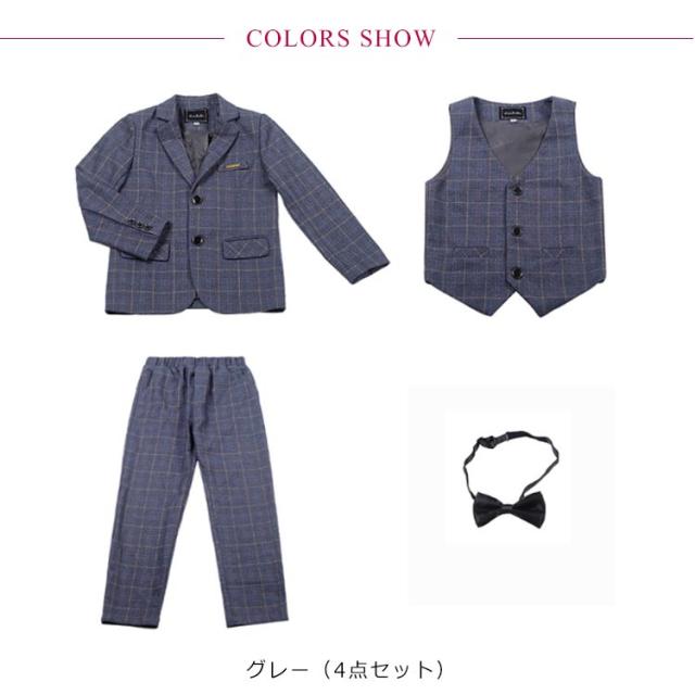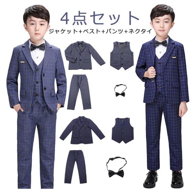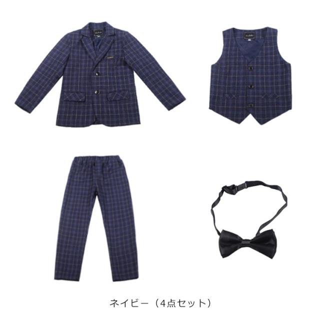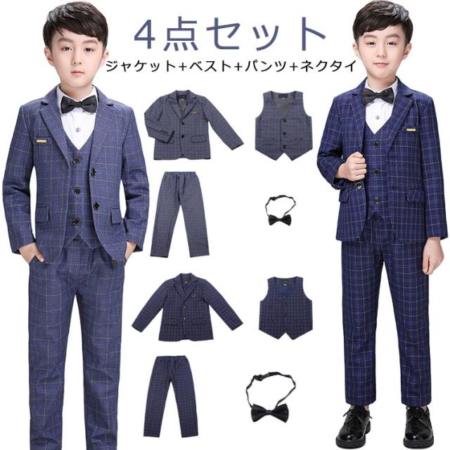 フォーマルスーツ 男の子 キッズ スーツ セットアップ 4点セット チェック柄 フォーマル 結婚式 発表会 子供 ジュニア スーツセット 大きいサイズ ネイビー 紺 グレー ジャケット ジレ パンツ ネクタイ 入学式 卒業式 セレモニー スーツ おしゃれ 【送料無料】