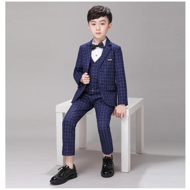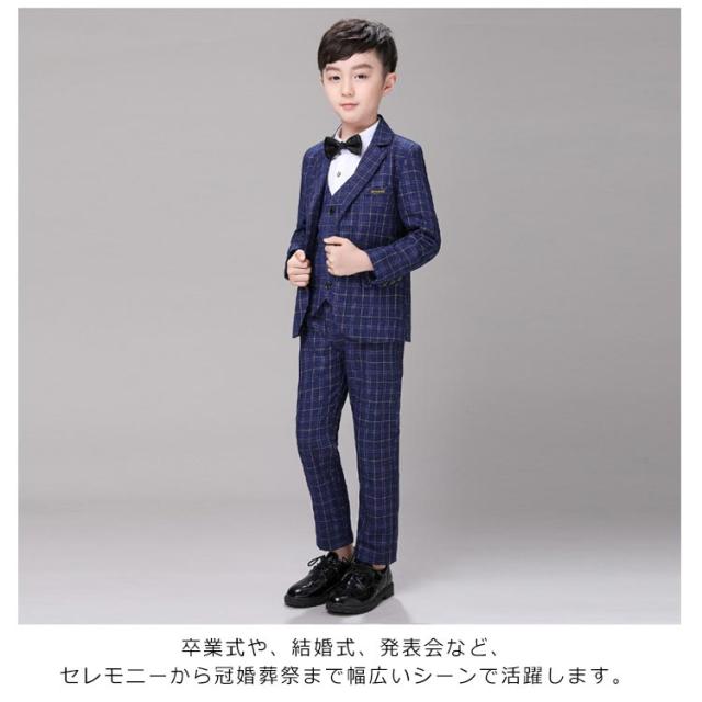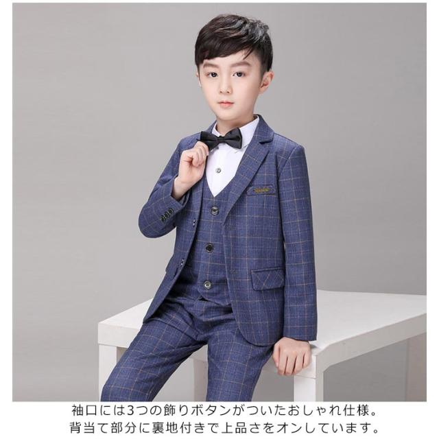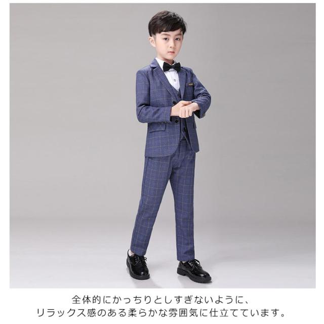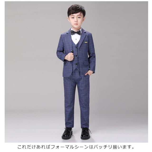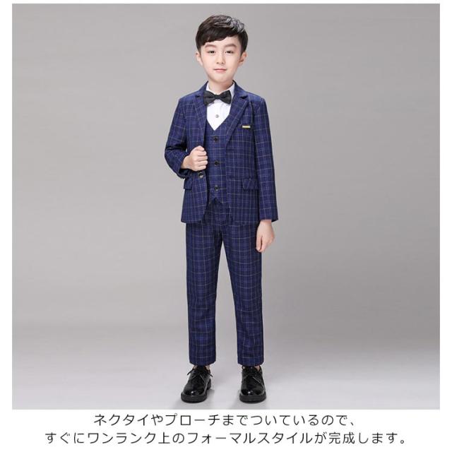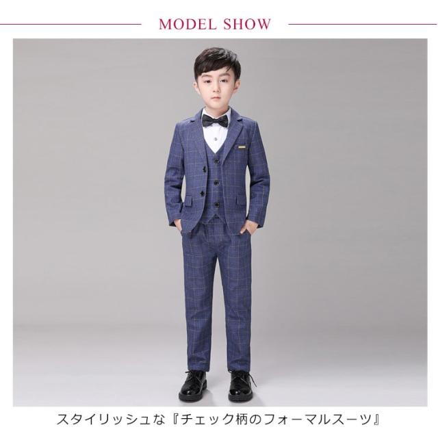 | スタイリッシュな『チェック柄のフォーマルスーツ』【ジャケット+ベスト+パンツ+ネクタイの4点セット】 これだけあればフォーマルシーンはバッチリ揃います。 全体的にかっちりとしすぎないように、リラックス感のある柔らかな雰囲気に仕立てています。 袖口には3つの飾りボタンがついたおしゃれ仕様。背当て部分に裏地付きで上品さをオンしています。 ハーフパンツよりも大人っぽく着られるロングパンツには蝶ネクタイを合わせて、可愛らしさも兼ね備えたスタイルです。 ネクタイやプローチまでついているので、すぐにワンランク上のフォーマルスタイルが完成します。 卒業式や、結婚式、発表会など、セレモニーから冠婚葬祭まで幅広いシーンで活躍します。 | |