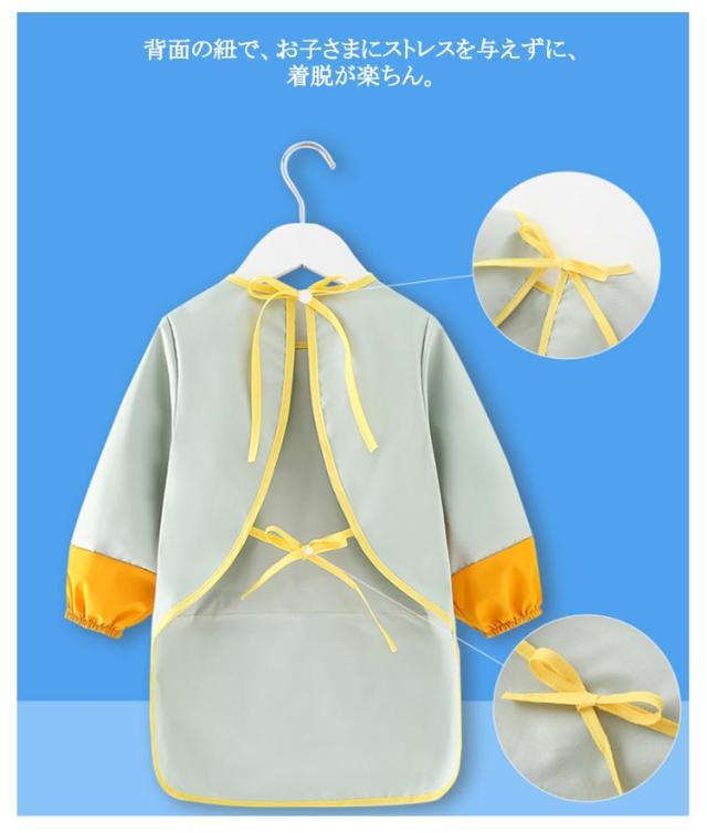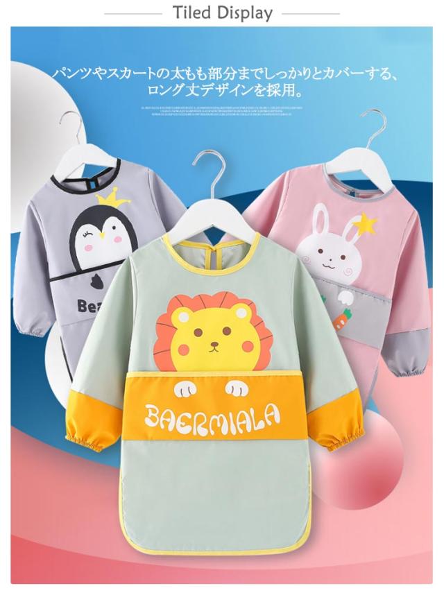 | 食べこぼしを気にせずに、お食事タイムをもっと楽しく!キッズ用ロング丈スモックが新登場。 パンツやスカートの太もも部分までしっかりとカバーする、ロング丈デザインを採用。 洋服の汚れを気にしないで、のびのび食事が楽しめる♪ キュッと絞れるゴム入りの袖口で、幼稚園や保育園でのランチタイムはもちろん、外食やよそ行きの服装の時でも大丈夫! スモッグ前面の幅広ポケットが食べこぼしをしっかりキャッチするから、後片付けも手間いらず。 背面の紐で、お子さまにストレスを与えずに、着脱が楽ちん。 生地の表面は、食べ物の汚れやドリンクの水滴をサッと弾くはっ水加工済みなので、お手入れ簡単、いつでも清潔に使えるのが嬉しいポイント! 90サイズ〜120サイズまで、お子さまの成長に合わせてチョイスできる豊富なサイズ展開も魅力。 | |