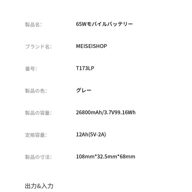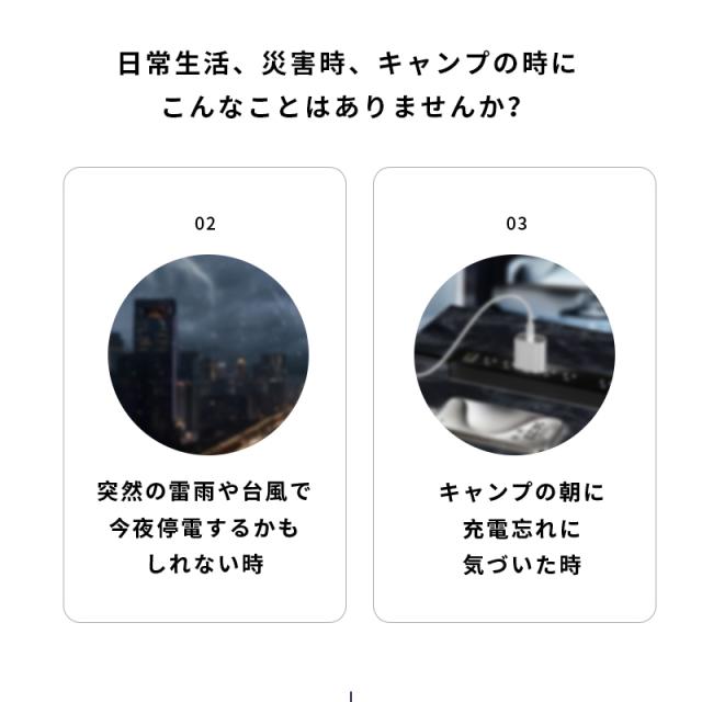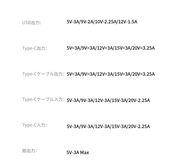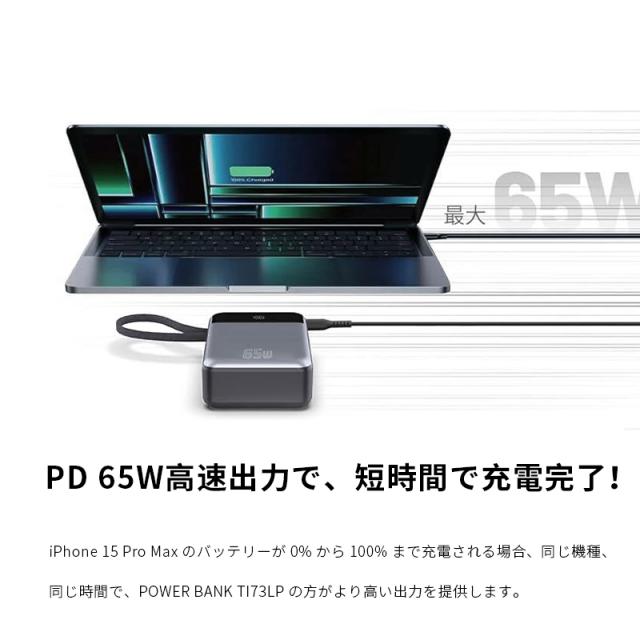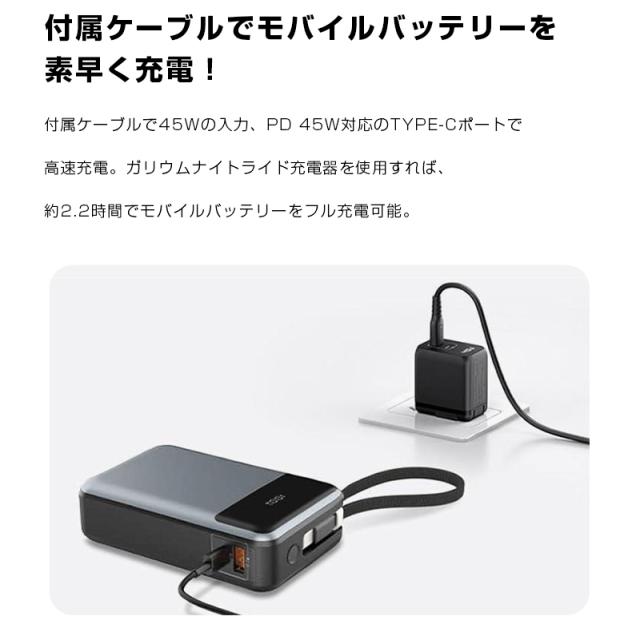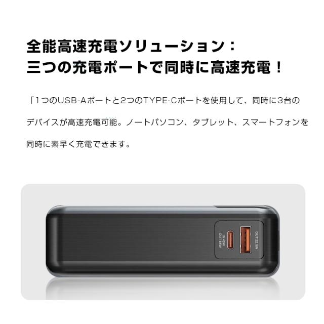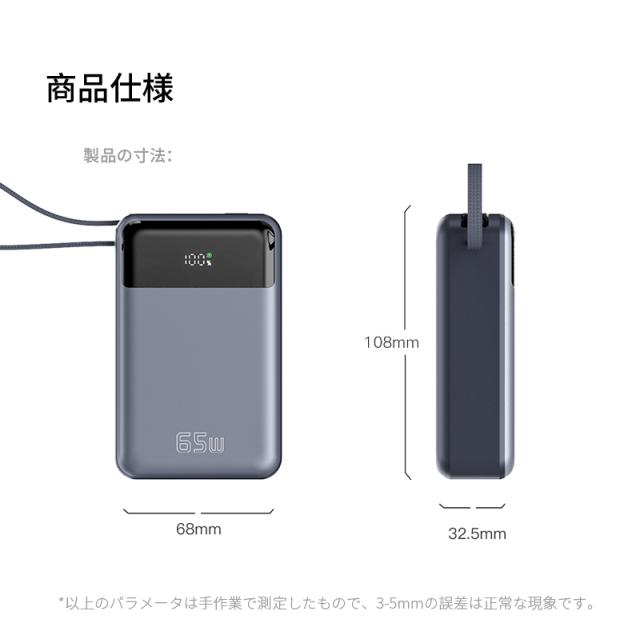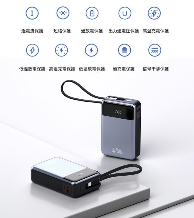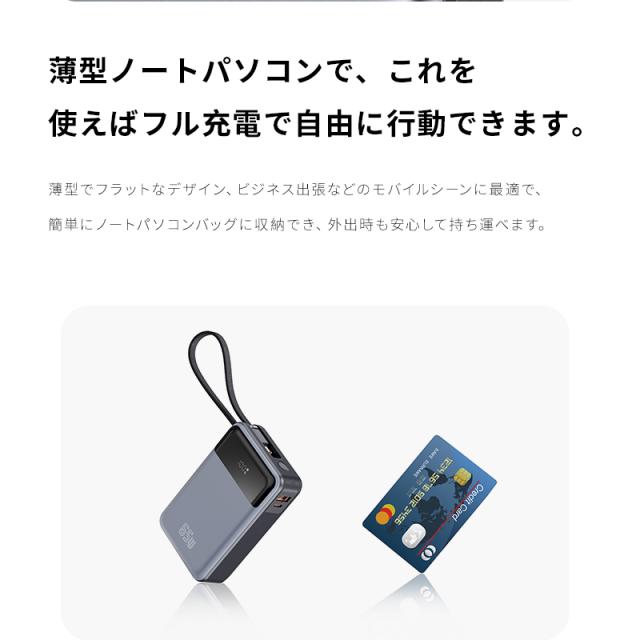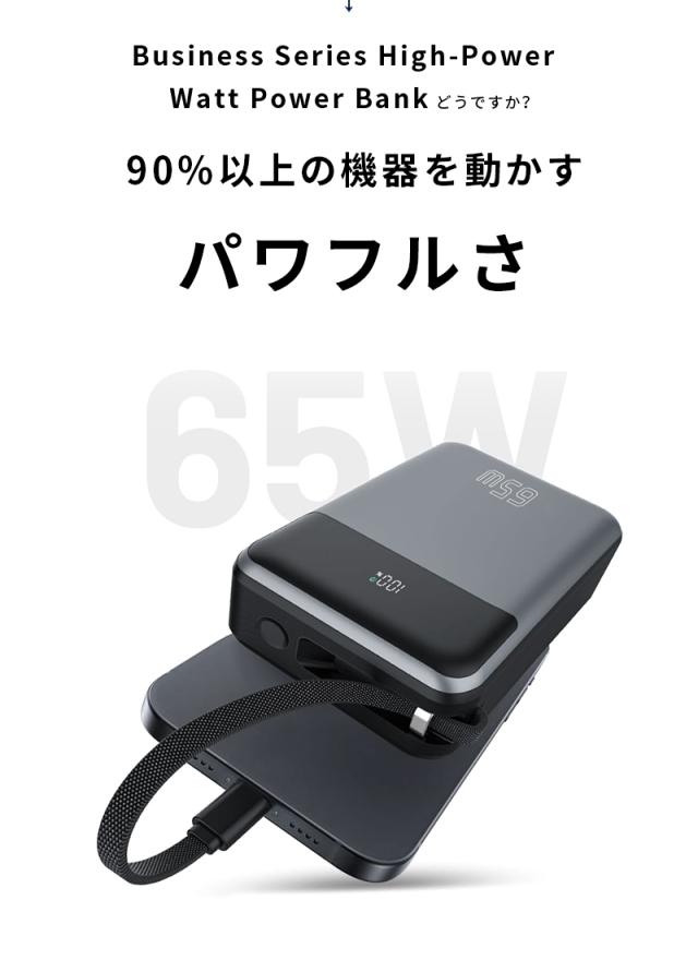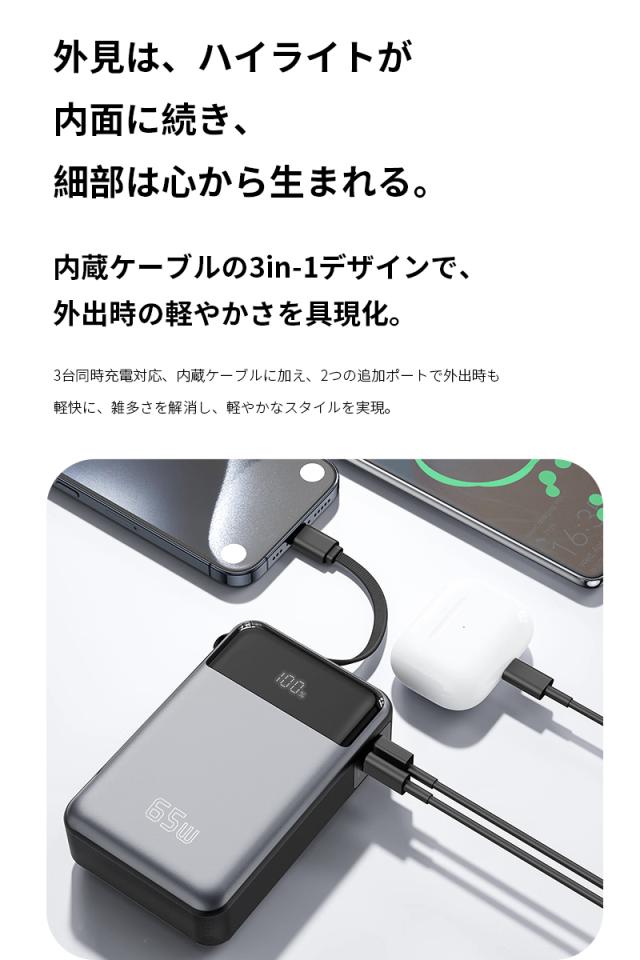 一体型のType-Cケーブル(PD65W)を備えており、USB出力ポート、Type-C出力ポート、そしてType-C入力ポートも搭載され、最大3台の設備を同時に充電可能です。スマホやノートPC、タブレットの急速充電をサポートするのはもちろん、小電力モードも搭載で、イヤホンやスマートウォッチなどの小電力設備の充電も対応。この一台だけで、出張中や旅行中にもコンセント不要で、効率よく充電できます。