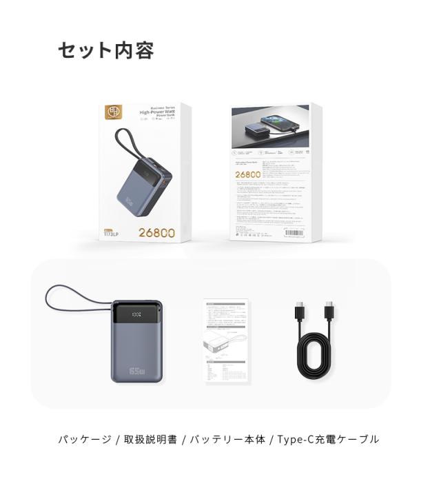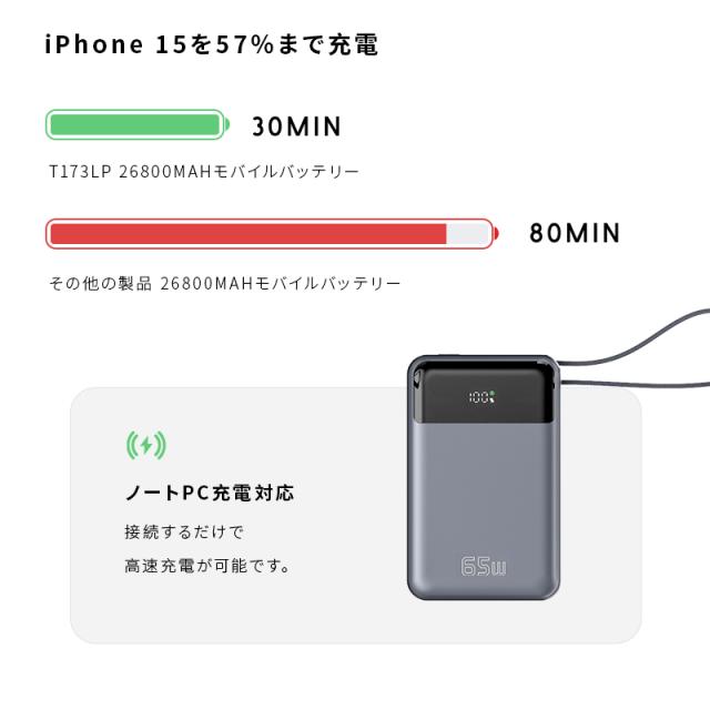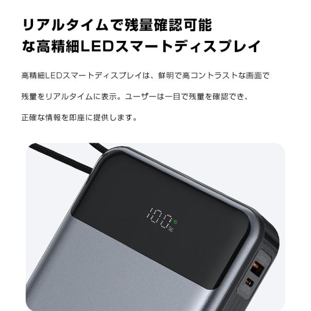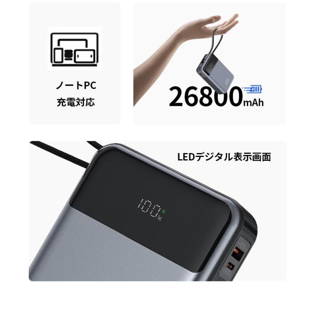 モバイルバッテリー 26800mAh 99.16Wh 大容量 急速充電 iPhone17/16/15充電 軽量 【2026年新登場】 ケーブル内蔵 3台同時充電 パワーバンク Type-C出入力 USBポート PD/QC3.0対応 PD65W ノートパソコン充電 ストラップ付き 防災グッズ PSE認証【PL保険加入済み製品・安心】