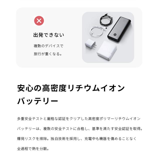 26800mAhの大容量で、iPhone 16を約4.5回フル充電できます。互換性も高く、旅行や出張など電源の取りにくい環境でもバッテリー切れの心配がありません。さらにコンパクトで、カバンやポケットに入れても、重量感をかけず、持ち運びに超便利です。