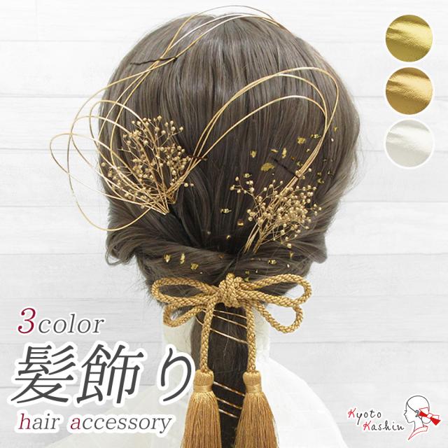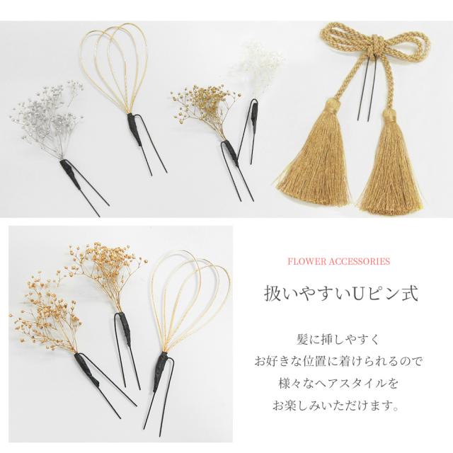 【2セットまでメール便送料無料】成人式 振袖 髪飾り 9点セット タッセル 水引 水引飾り 編みおろし カスミソウ かすみ草 プリザーブドフラワー 花 ゴールド 金箔 銀箔 箔 ヘアアクセサリー / 和装 七五三 753 浴衣 袴 入学式 卒業式 結婚式 ブライダル ウェディング