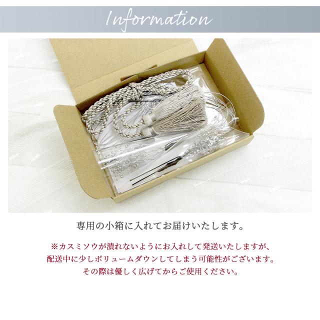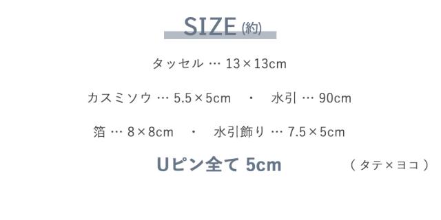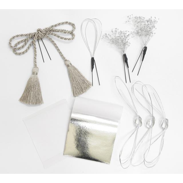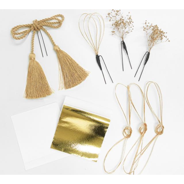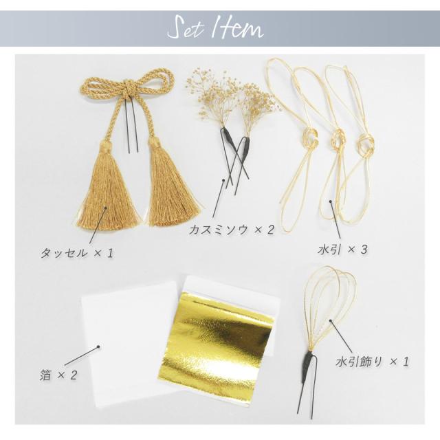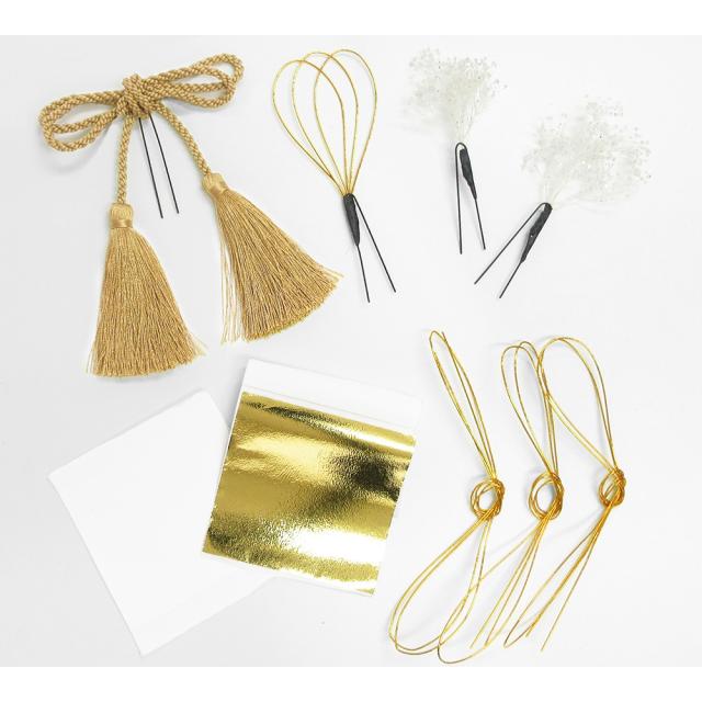タッセル:1個、カスミソウ:2個、水引:3本、箔:2枚、水引飾り:1個