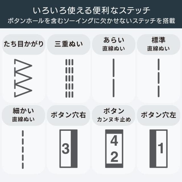 ・ぬいにくい段差も、厚物ぬいもスムーズ。 ・ボビンケースのいらない水平全回転カマ。 ・糸通し器で針穴への糸通しがスピーディ。 ・デニムのような厚地も重ねてスムーズにぬえます。 ・目とびを防ぐかがり押さえ。 ・操作方法が選べる2WAY式。※フットコントローラーは別売りです。