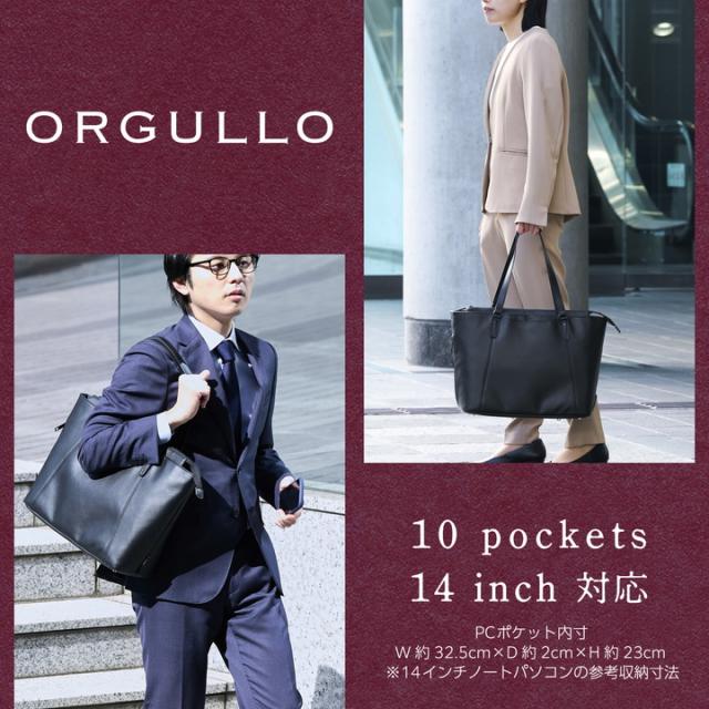 通勤から休日まで幅広く使える!A4サイズ対応の十分な収納力を備えた、ORGULLO(オルガロ)シリーズの大容量トートバッグです。程よい柔らかさとマットな質感の合成皮革を採用。小物の収納に便利なポケットも豊富で、背面ポケットは底部のファスナーを開けるとキャリーケースのハンドルを挿し込める仕様になっています。