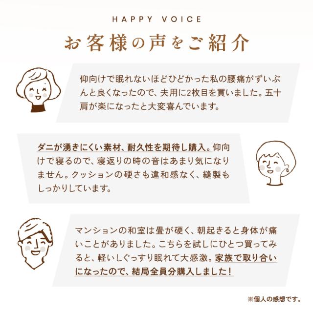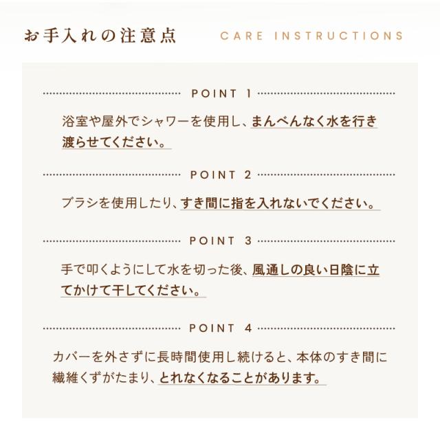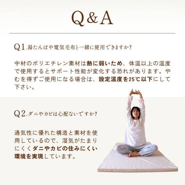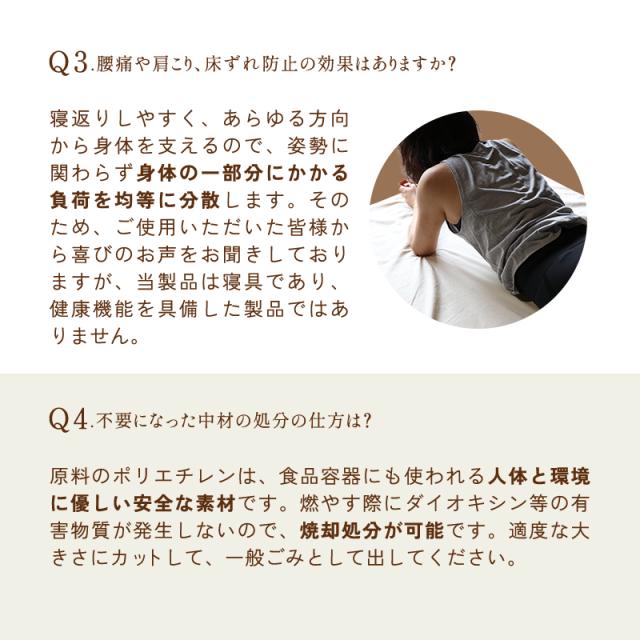 【使い方と注意】 本体は熱に弱いため、湯たんぽや電気毛布などの高温になる暖房器具との併用はお避け下さい。 お使いの際は、体温程度の温度設定でお使いください。 カバーを付けたまま長期間使用していると、カバーの繊維が本体のすき間に入り込み、取れなくなることがありますので、時々カバーを外してお手入れしていただくことをお勧めします。 【洗い方】 本体: 本体は、屋外や浴室での洗浄が可能です。シャワー等で洗い流してください。なお、熱湯はお避け下さい。(40℃以下の水推奨) 洗剤を使用する場合は、中性洗剤をご使用ください。 洗った後は、風通しの良いところで陰干ししてください。 カバー: 洗濯機を使用される場合、洗濯ネットの使用、水位の設定などは取扱説明書に従ってください。 必ずファスナーを閉めて洗濯してください。 閉めずに洗濯するとファスナーが破損する恐れがあります。 素材の特性上、長時間日光や蛍光灯にあたると変色することがあります。 【収納と保管の仕方】 三つ折りにして収納することが可能です。 カバーを付けたまま長期間保管していると、カバーの繊維が本体のすき間に入り込み、取れなくなることがあります。 |