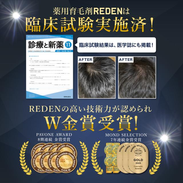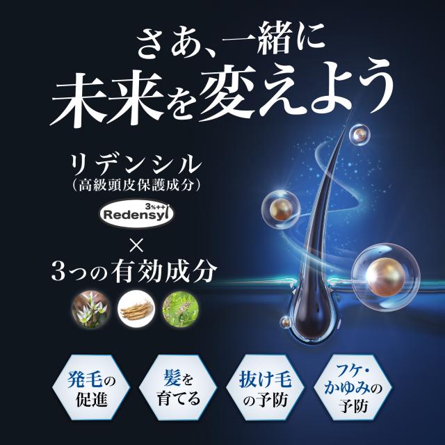 2021年に独自の臨床試験を実施、その結果が医学誌に掲載。さらにPAVONE AWARD(パヴォ—ネアワード)金賞を8期連続・MOND SELECTION(モンドセレクション)金賞を6年連続で受賞し、TVや有名雑誌など多くのメディアで掲載された話題の医薬部外品の薬用育毛剤。発毛促進、育毛効果が認められた三大有効成分と世界的に注目を集めるスカルプサポート成分リデンシルを独自配合。