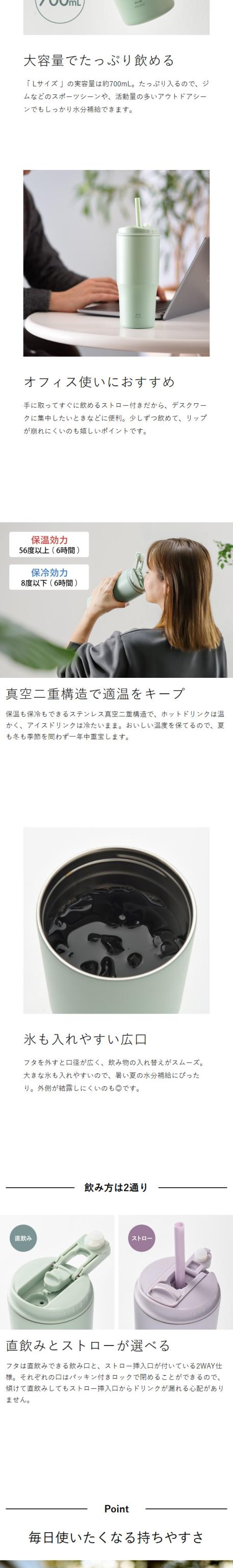 保温・保冷もおまかせの ストロー付きタンブラー マットな質感とニュアンスカラーが印象的な『 BRUNO 2WAY ストロータンブラー L 』。保温・保冷に優れた真空二重構造のストロー付きステンレスタンブラーで、冷たい飲み物もホットドリンクもおいしい温度を保ちます。飲み口はストローと直飲みの2WAYで選べて、フタを外すと大きな氷が入れられるので便利。700mLの大容量で、普段使いはもちろんスポーツシーンやアウトドアシーンでもしっかり水分補給。食洗機OKで、フタのパッキンを外して洗えるので清潔に使い続けられます。