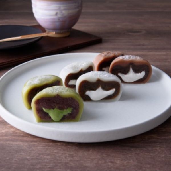 加熱方法にこだわり、香り高く仕上げたコーヒー餡を使ったカフェオレ大福、福岡の八女茶をもち生地、クリームに使用した抹茶クリーム大福、オランダのデザーン社の香り高いココアを使用したショコラクリーム大福をセットしました。
