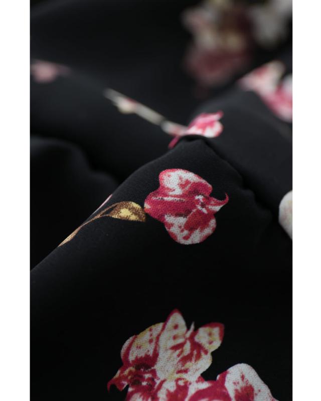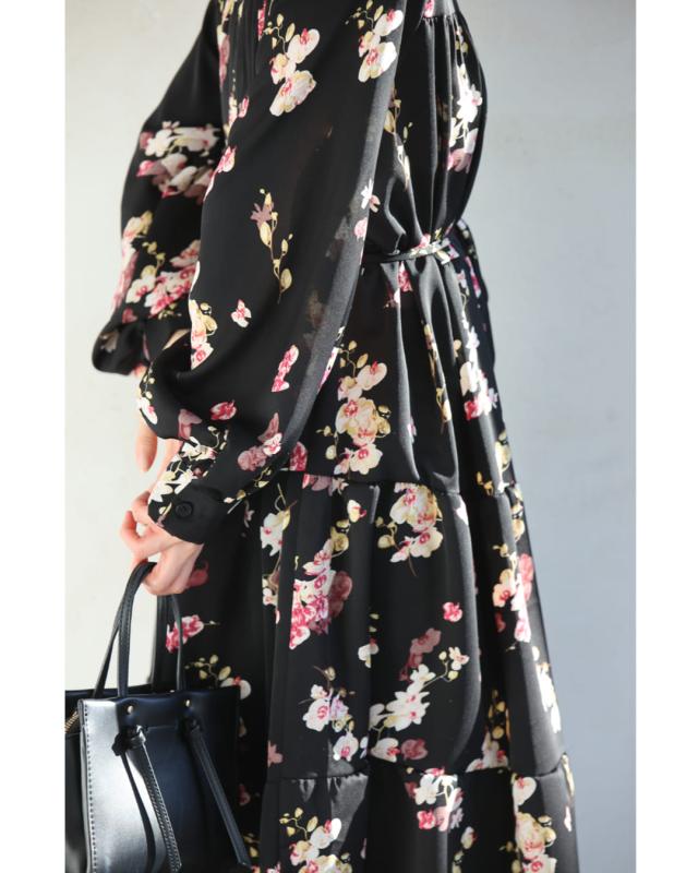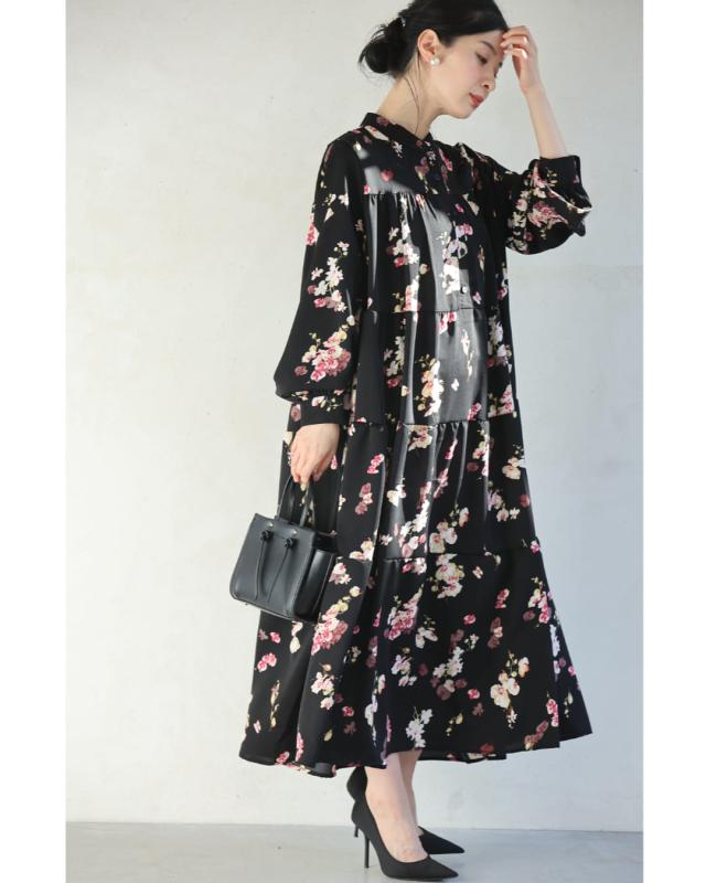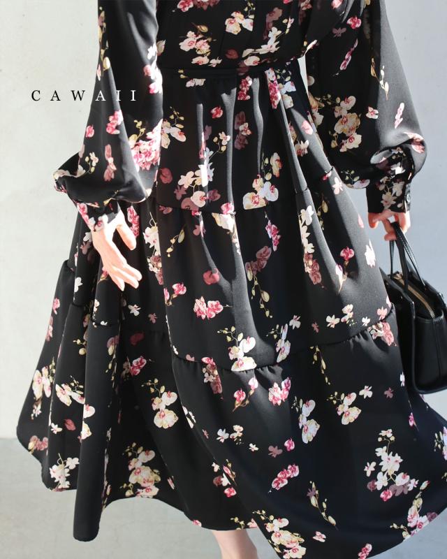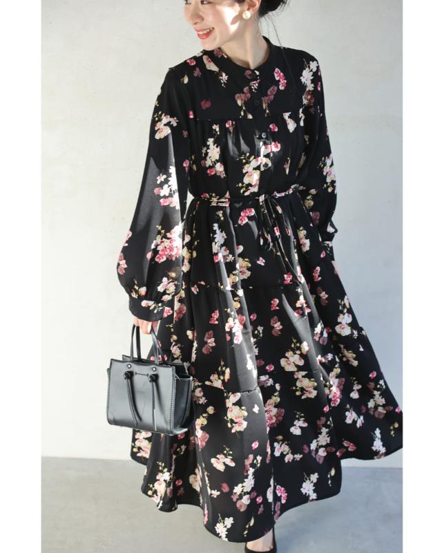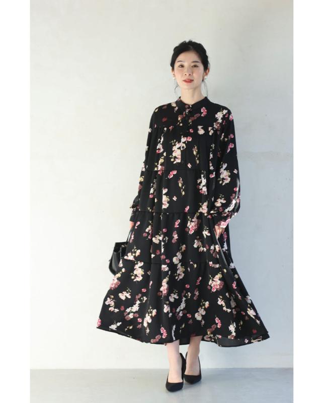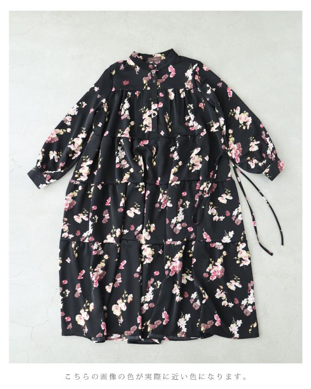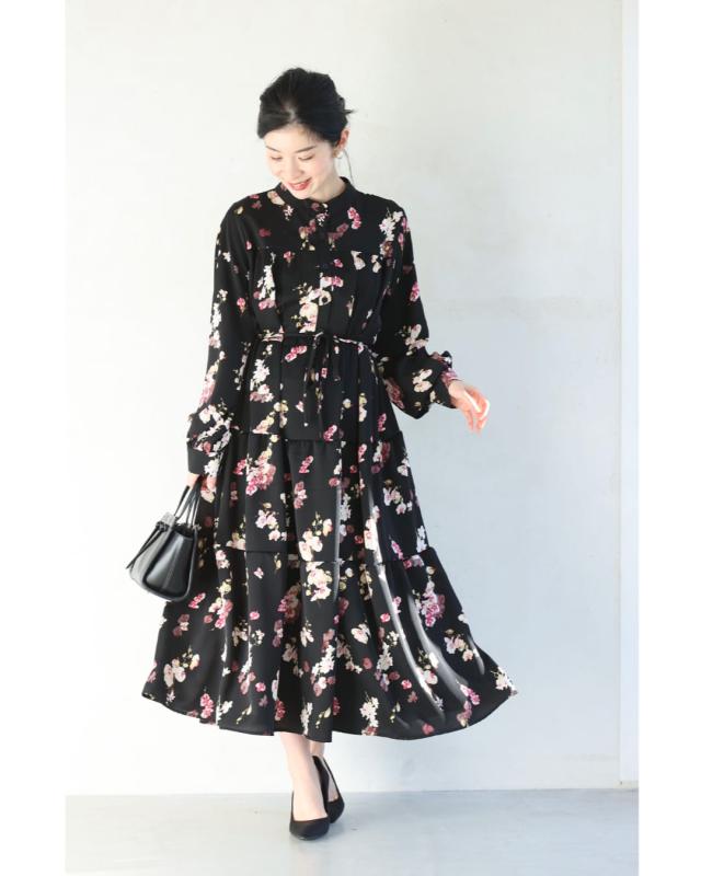 w61149ps 新作 新着 再入荷 CAWAII FRENCHPAVE フレンチパヴェ エレガント ベーシック カジュアル 可愛い かわいい カワイイ おしゃれ オシャレ お洒落 個性 個性的 定番 ベーシック 大人かわいい 大人可愛い 上品 女性らしい デザイン スタンダード ナチュラル きれいめ キレイめ シンプル フェミニン レディース レディースファッション 大人 ママ ミセス 30代 40代 50代 60代 黒 ほころぶ 花 ティアード ロング ワンピース 紐ベルト付き 長袖 長そで ロング袖 スタンドカラー ふんわり スタイルアップ効果 ウエストマーク メリハリ ワンサイズ Sサイズ Mサイズ Lサイズ 2Lサイズ フリーサイズ フリー 小さめ 小さめサイズ小さい 小さいサイズ 低身長 痩せ ほっそり 小柄 細身 標準サイズ 大きめシルエット 大きい 大きめ ビッグシルエット ぽっちゃり F サイズ自由 薄手 涼しい ずずしい 春 夏 秋 春服 春物 夏 夏服 夏物 秋服 秋物 ブラック 黒 黒色 柄 総柄 花柄 フラワー 花 フラワー柄 小花 小花柄 日常使い おでかけ 旅行 女子会