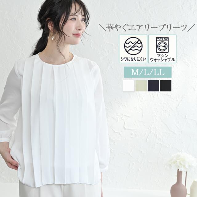 シワになりにくい プリーツ ブラウス レディース シフォンブラウス トップス 春 長袖 シフォン プルオーバー フリル 無地 裏地 襟なし ノーカラー フォーマル オフィス セレモニー オケージョン 白 黒 ネイビー グリーン M L LL 大きいサイズ シワになりにくいブラウス