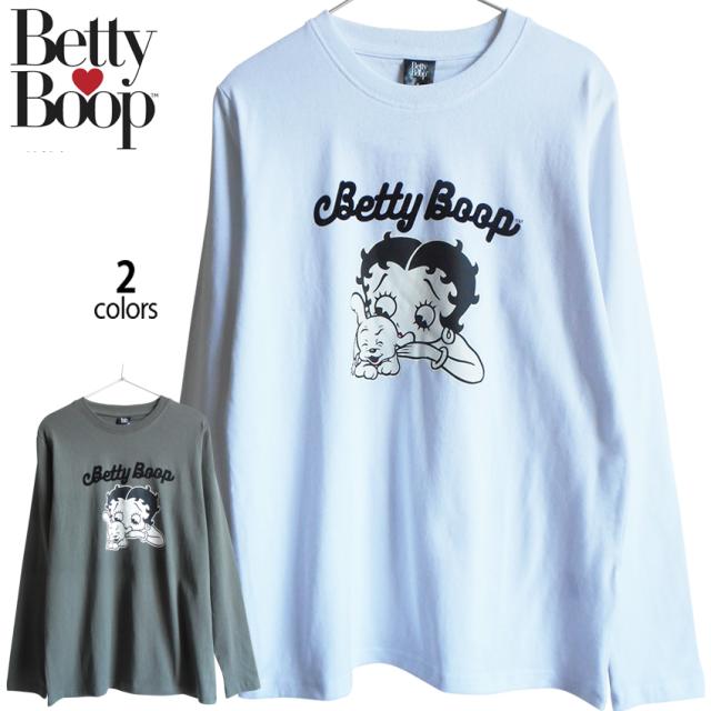 送料無料 ベティちゃん ベティ—ブープ bettyboop アメコミ 長袖Tシャツ ロンT フロッキープリント レディース メンズS M ロゴ パジー 犬 ペアルック 双子コーデ 男女兼用 かわいい 大人 綿100% 春 秋 白 グレー カーキ チャコール