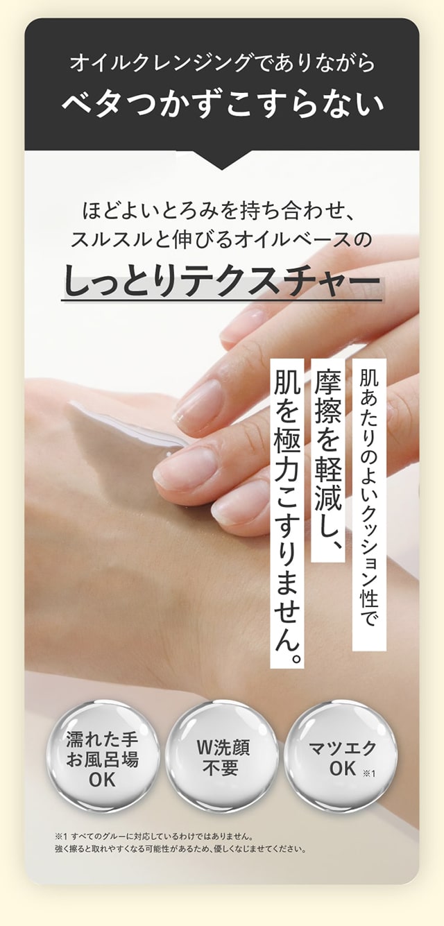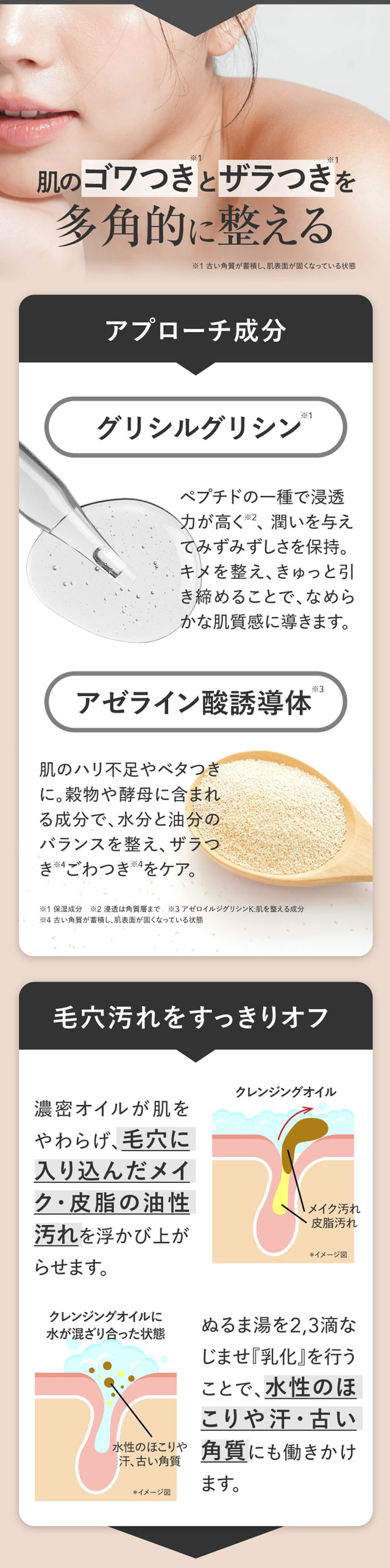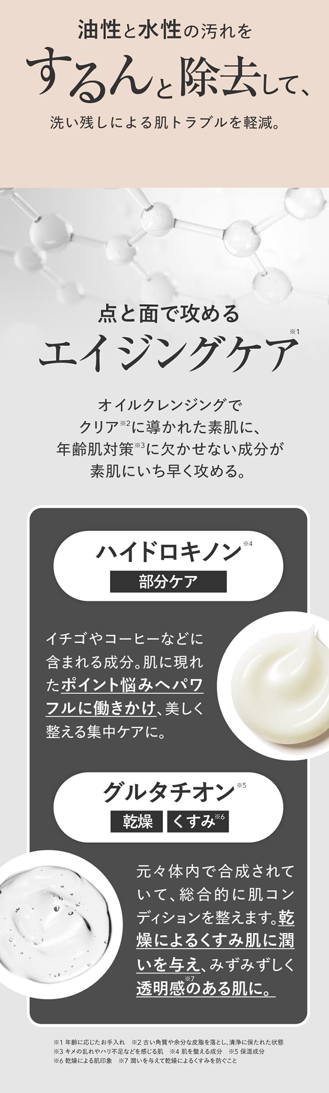 | 特徴 | 濃密オイルで解きほぐす。理想のメイク落ち、毛穴ケア(*1)を搭載したオイルクレンジング。 < つっぱりにくい >< 濡れた手OK >< W洗顔不要 >< 毛穴にアプローチ(*1) > 植物由来のオイル配合。肌に高密着し、毛穴のメイク汚れにスルスルなじみ、つっぱりにくく優しく素早く溶かし出します。 ■肌のゴワつき(*2)・ザラつき(*2)を多角的に整える 『グリシルグリシン(*3)』『アゼライン酸誘導体(*4)』がアプローチ。炭(*5)やグリコール酸(*6)がちゅるんとなめらかな肌に整えるのを助けます。 また、濃密オイルが毛穴に入り込んだメイク・皮脂の油性汚れを浮かび上がらせ、乳化させることで水性のほこりや汗・古い角質にも働きかけ、洗い残しによる肌トラブルを軽減。 ■点と面で攻める。エイジングケア(*7) クレンジング後、ポイント集中ケア成分『ハイドロキノン(*6)』、乾燥によるくすみ肌に潤いを与え、透明肌(*8)に導く『グルタチオン(*3)』がいち早く攻める。 負担感の少ない優しいオイルクレンジングを目指し、潤いを逃さない植物オイル配合・肌あたりのよいテクスチャー・国際規格認定工場での国内製造にこだわりました。 (*1)古い角質や余分な皮脂を落とし、清浄に保つこと (*2)古い角質が蓄積し、肌表面が固くなっている状態 (*3)保湿成分 (*4)アゼロイルジグリシンK:肌を整える成分 (*5)洗浄補助成分 (*6)肌を整える成分 (*7)年齢に応じたお手入れ (*8)潤いを与えて乾燥によるくすみを防ぐこと |