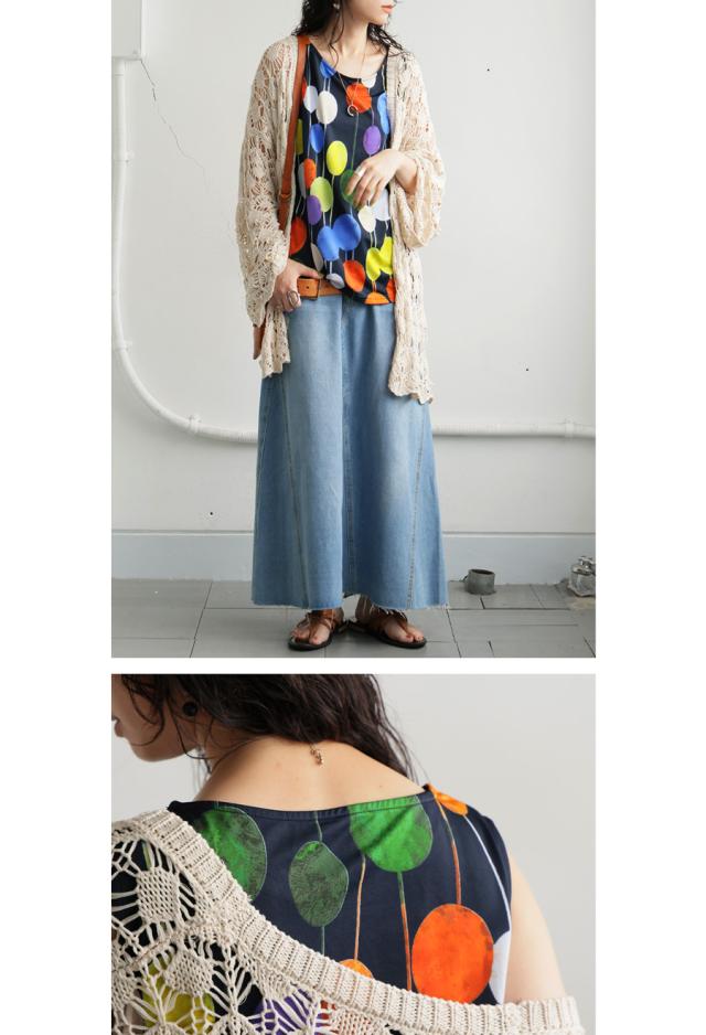 パッと目を引くカラフルな柄は、存在感がありながらも、どこか洗練されたムードを纏っており、シンプルなシルエットと相まって日常に取り入れやすい一枚です。