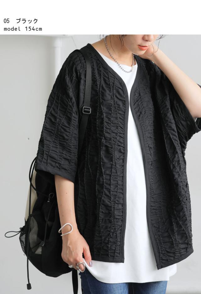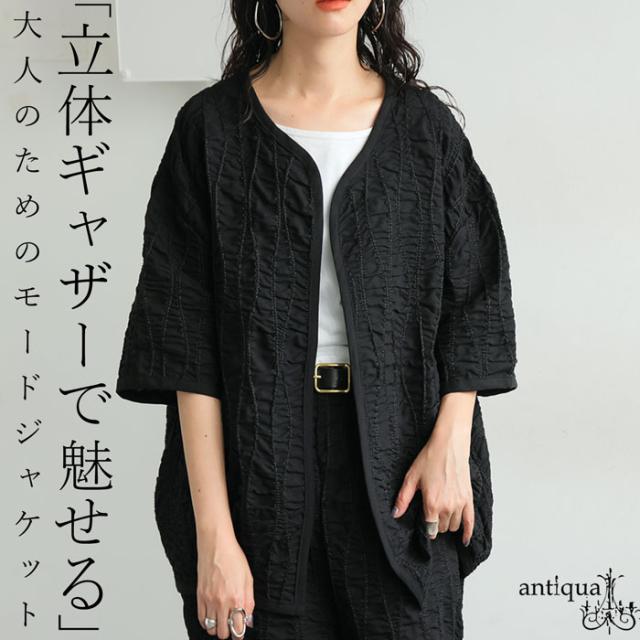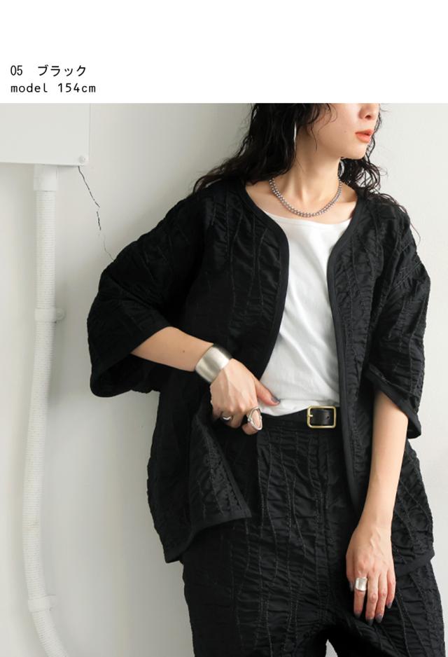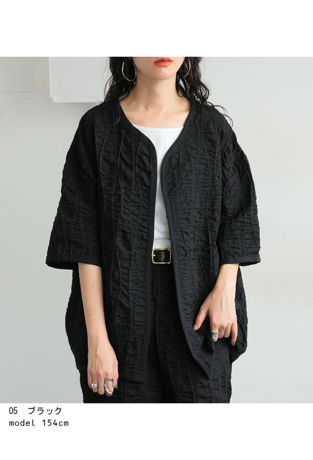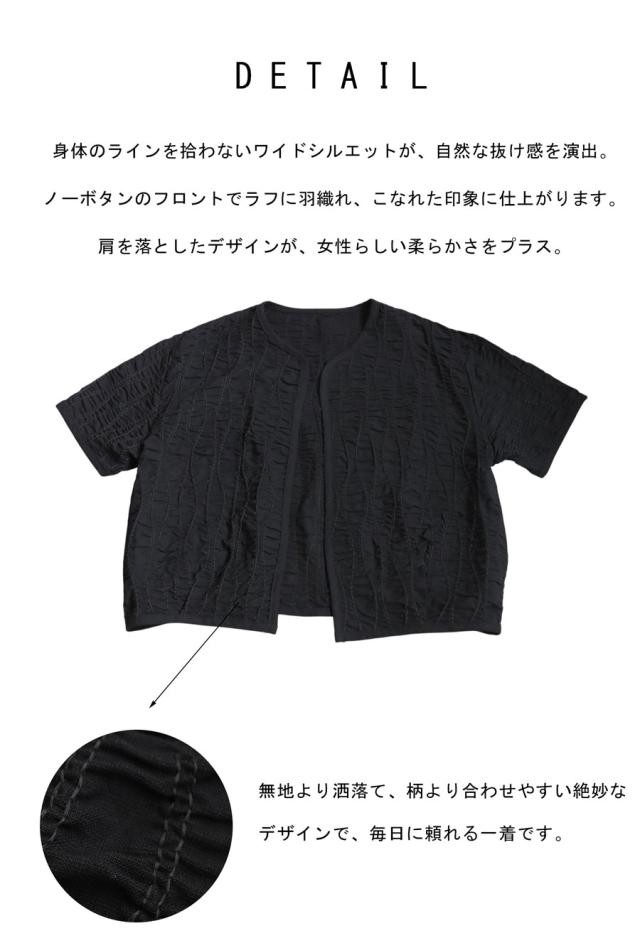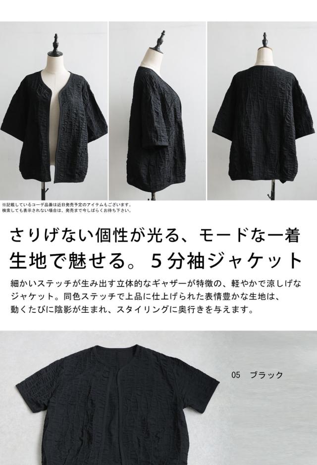 pa-03789 ジャケットトップス ライトアウター 5分袖 立体 ギャザー ステッチ 綿混 モード 体型カバー ブラック 黒 カジュアル シンプル ナチュラル セットアップ