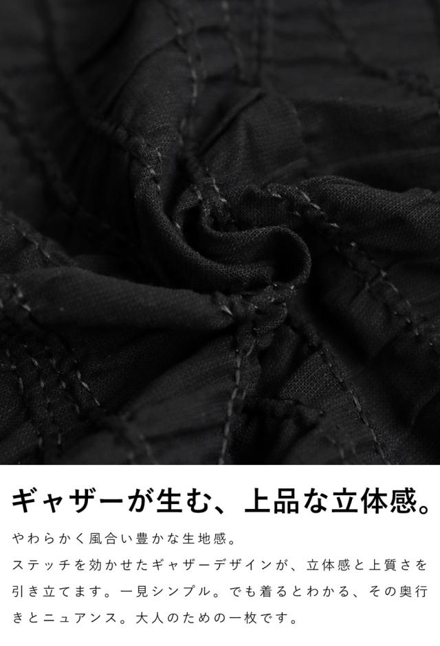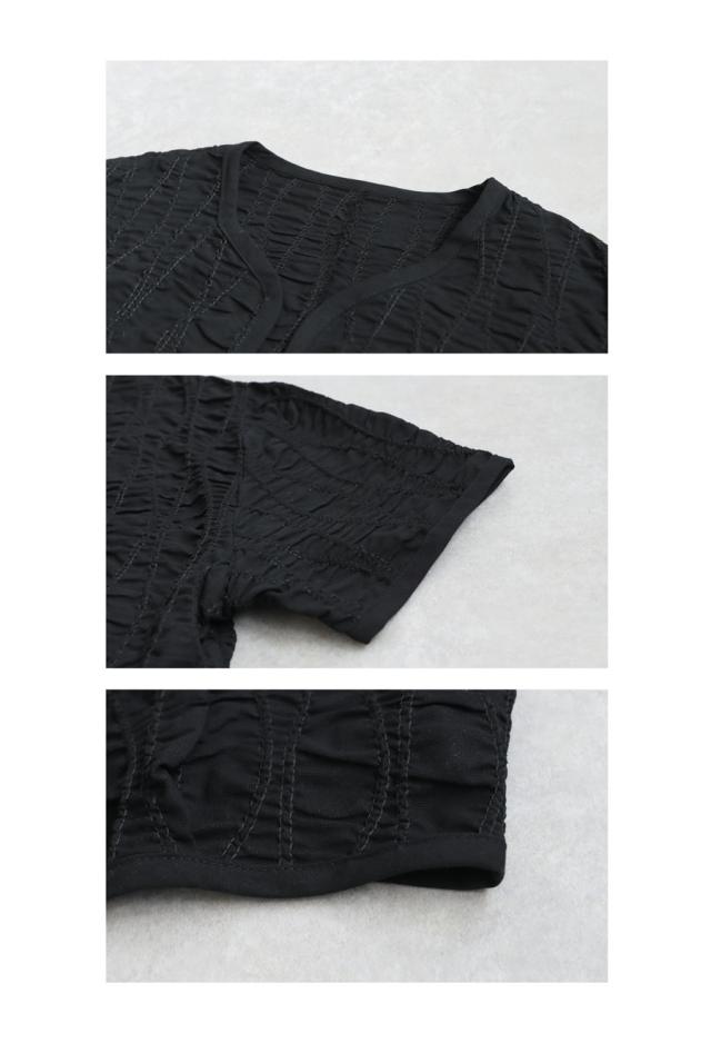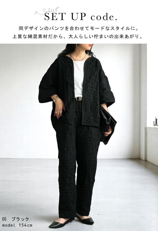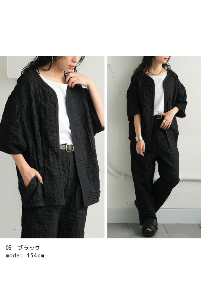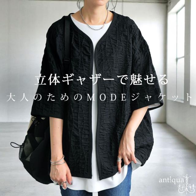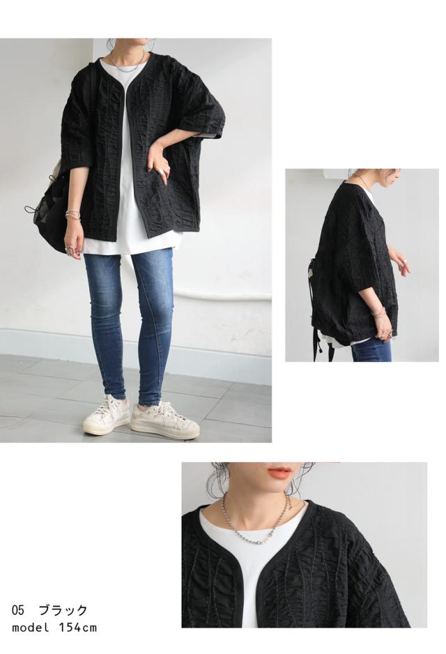 pa-03789 ジャケットトップス ライトアウター 5分袖 立体 ギャザー ステッチ 綿混 モード 体型カバー ブラック 黒 カジュアル シンプル ナチュラル セットアップ