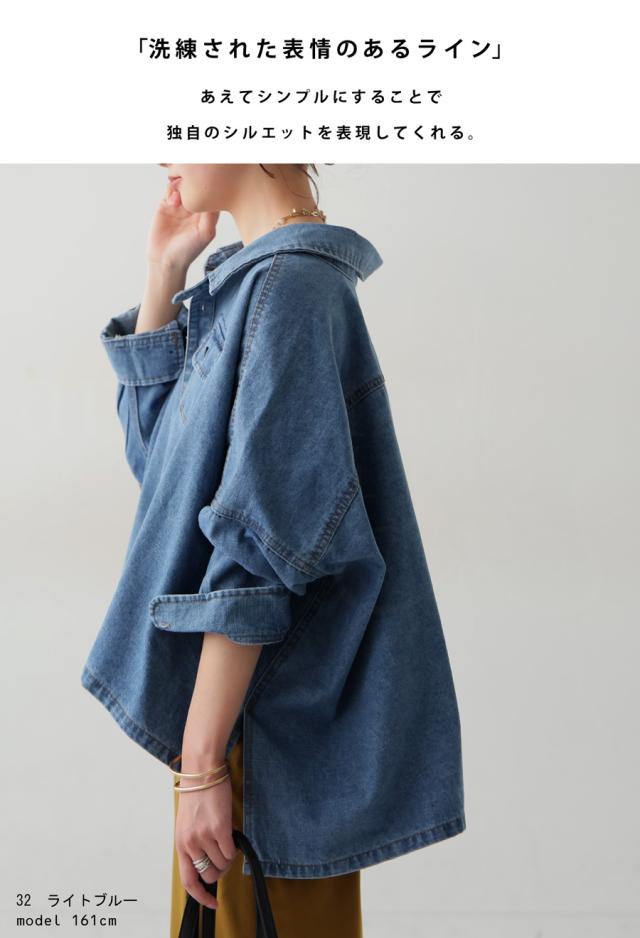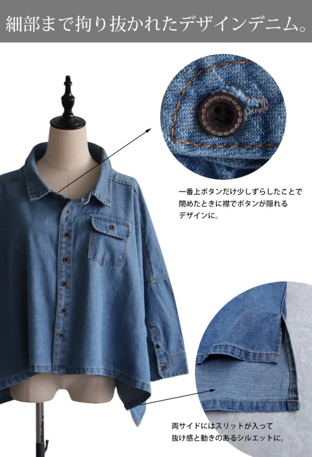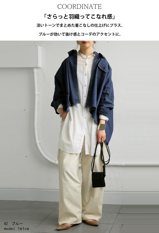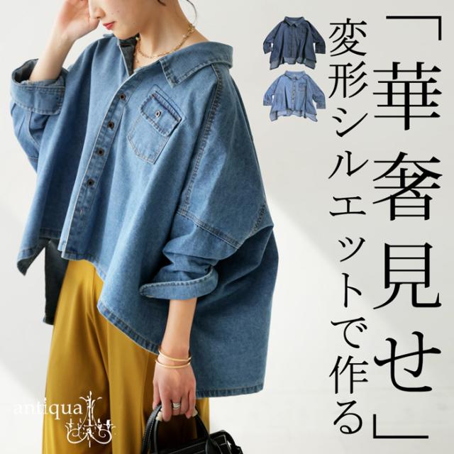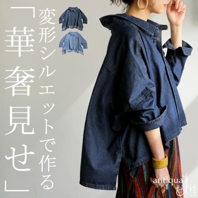 【検索ワード】デニムワイドジャケット ジャケット レディース トップス デニムワイドジャケット アウター 長袖 七分袖 デニム 羽織り ボタン レギュラーカラー デニムジャケット Gジャン デニムシャツ 変形 前後差 落ち感 折り返し スリット ライトアウター 軽アウター デザインデニム ドロップショルダー ワイドシルエット ドルマン ゆったり 木彫ボタン すっきり 体型カバー 華奢見せ こなれ 抜け感 トレンド オーバーサイズ 大きいサイズ 綿100 綿 コットン ライトブルー ブルー 青 antiqua アンティカ 大人 おしゃれ 10代 20代 30代 40代 50代 60代 春 秋 冬 お洒落 カジュアル かわいい かっこいい あんてぃか