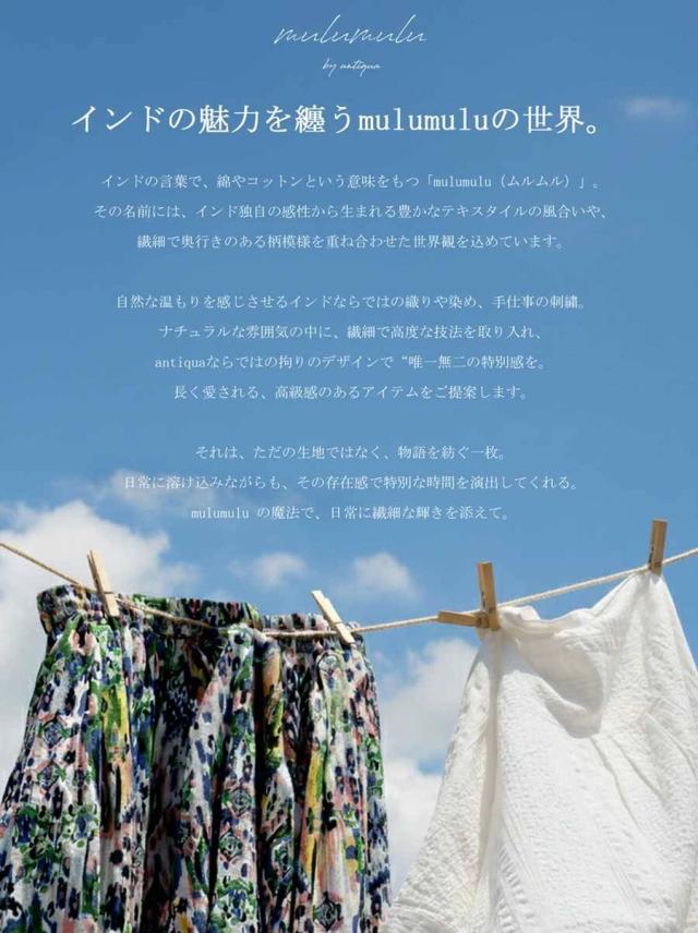 インドの伝統を感じる繊細な風合い、手仕事の刺繍にフォーカスを当てたantiqua発のブランド『mulumulu(ムルムル)』