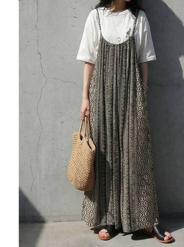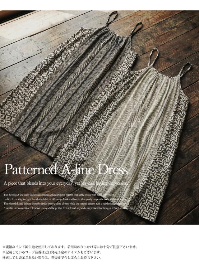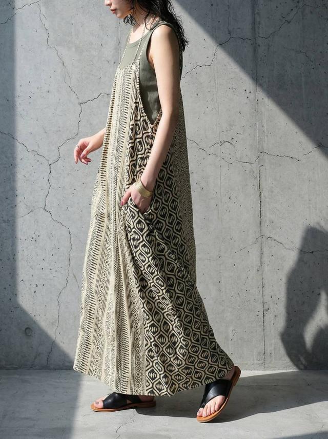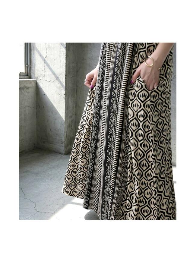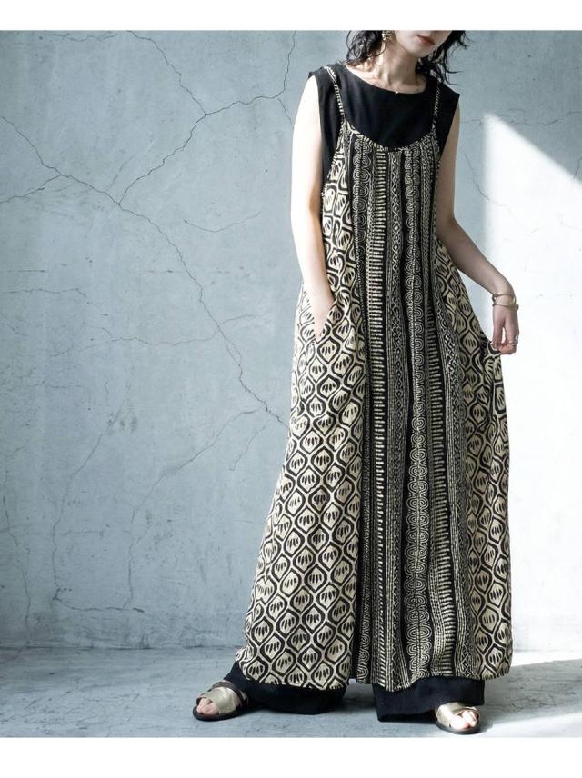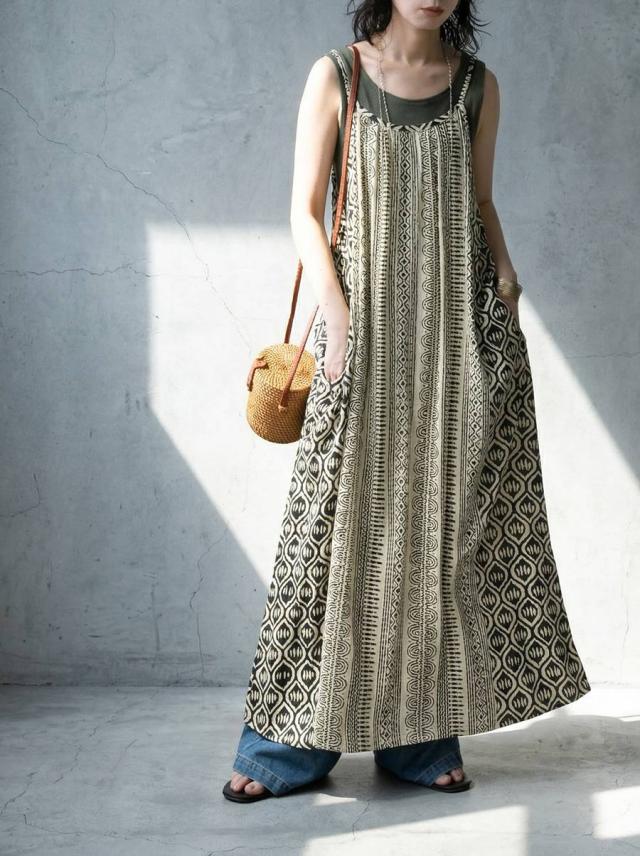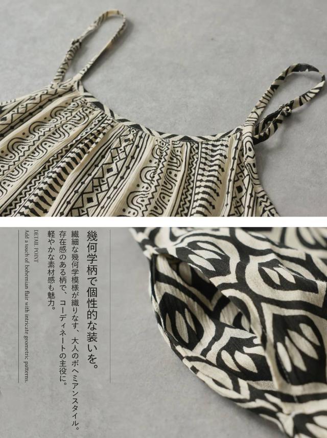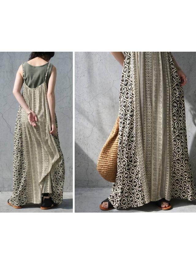 iya-00085 幾何学 キャミワンピ 柄ワンピ フレア Aライン レーヨン ロング ドレープ ゆったり 体型カバー リゾート ノースリーブ 着回し 大人カジュアル モード シンプル 軽やか