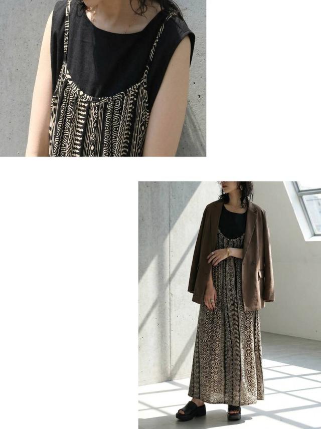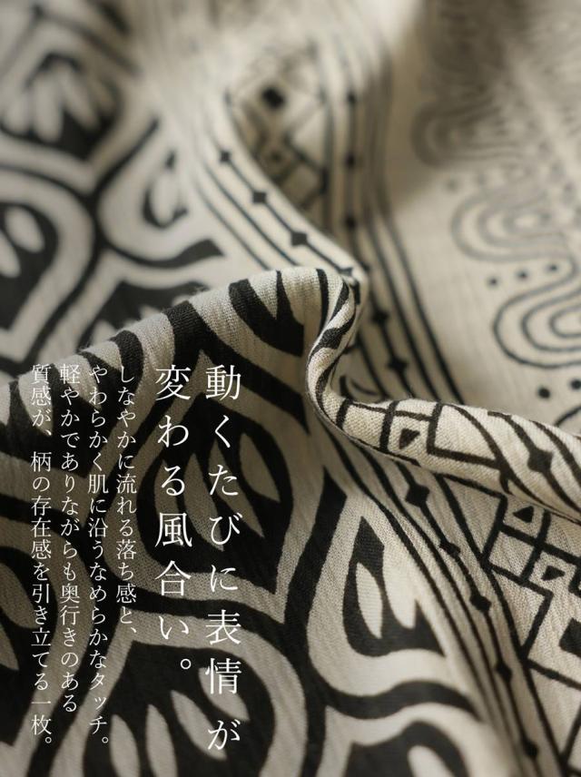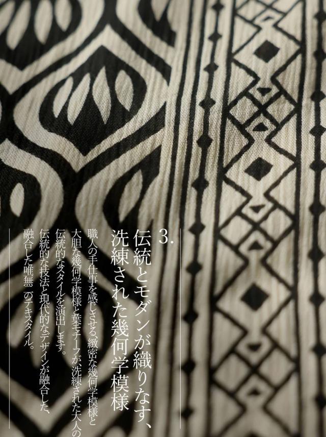 アジアンテイストな幾何学柄(幾何学模様・トライバル柄)のプリントが存在感を放ち、シンプルながらもエスニックな雰囲気を纏い、モードな印象に。
