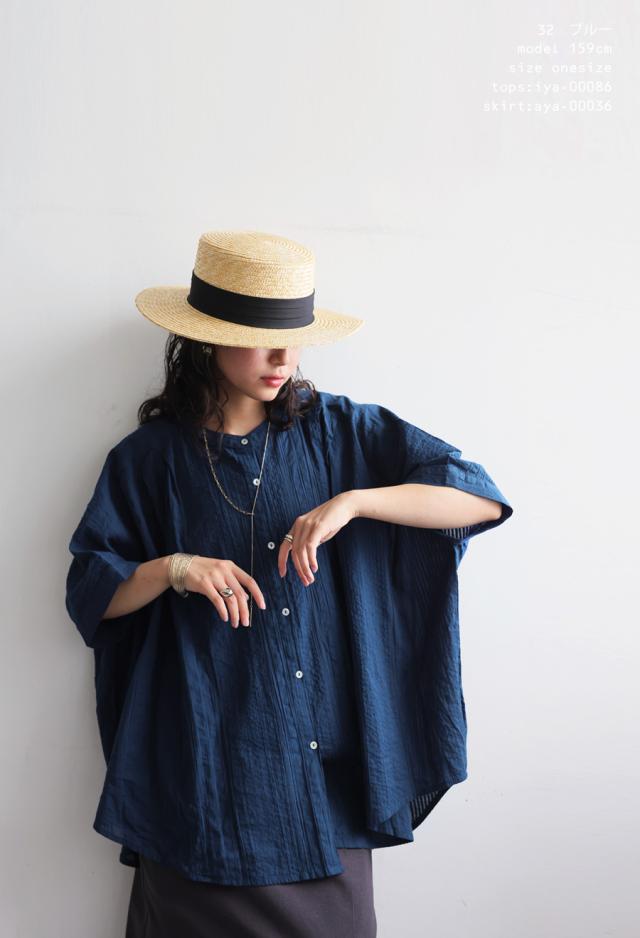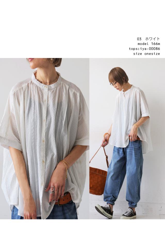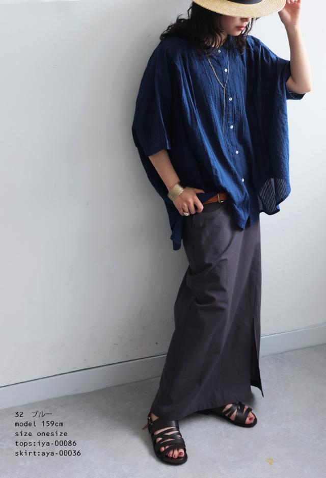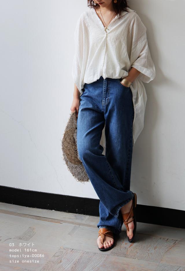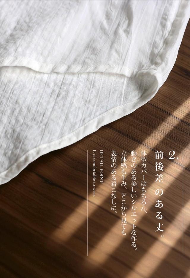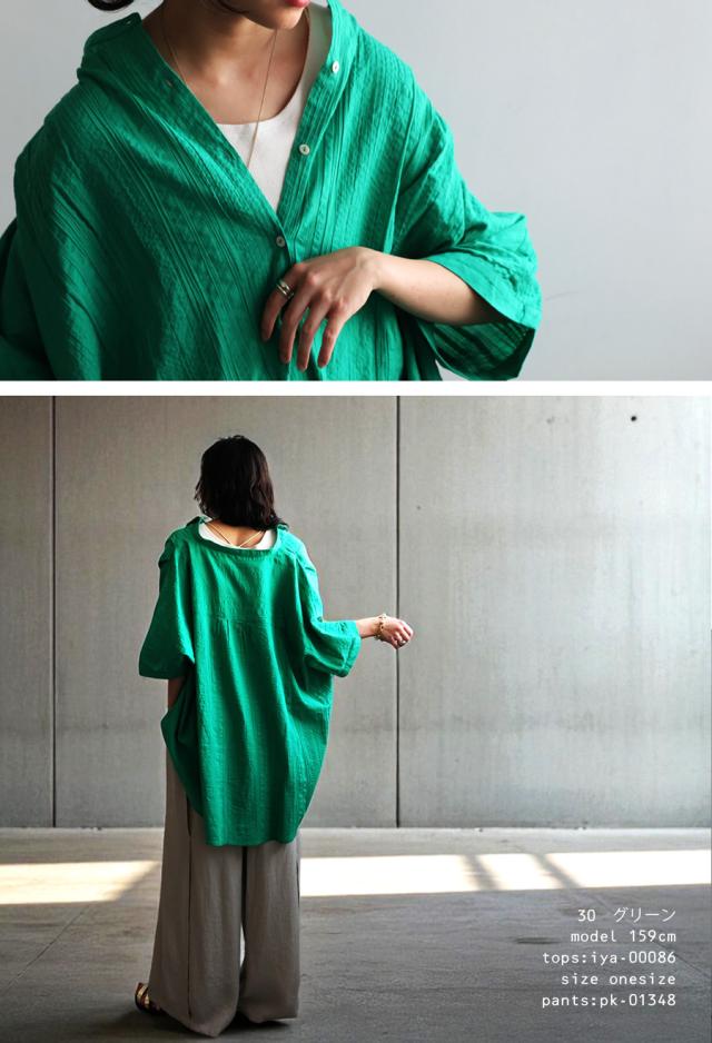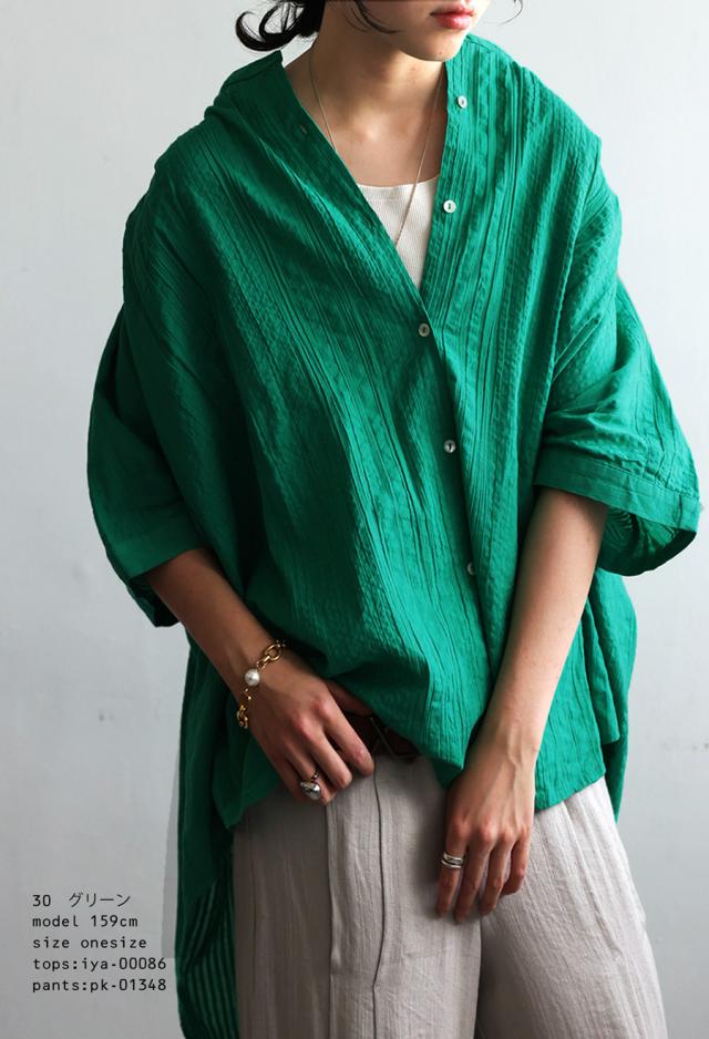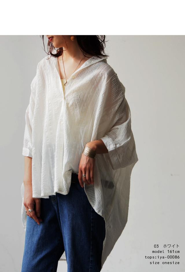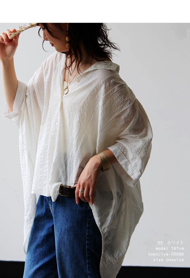 iya-00086 綿100 前後差ドルマンスリーブ 涼感 シボ感 ストライプ 凹凸 体型カバー ナチュラル ゆったり コットン 綿 前開き ボタン ブラウス 上品 シンプル 羽織