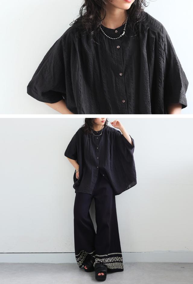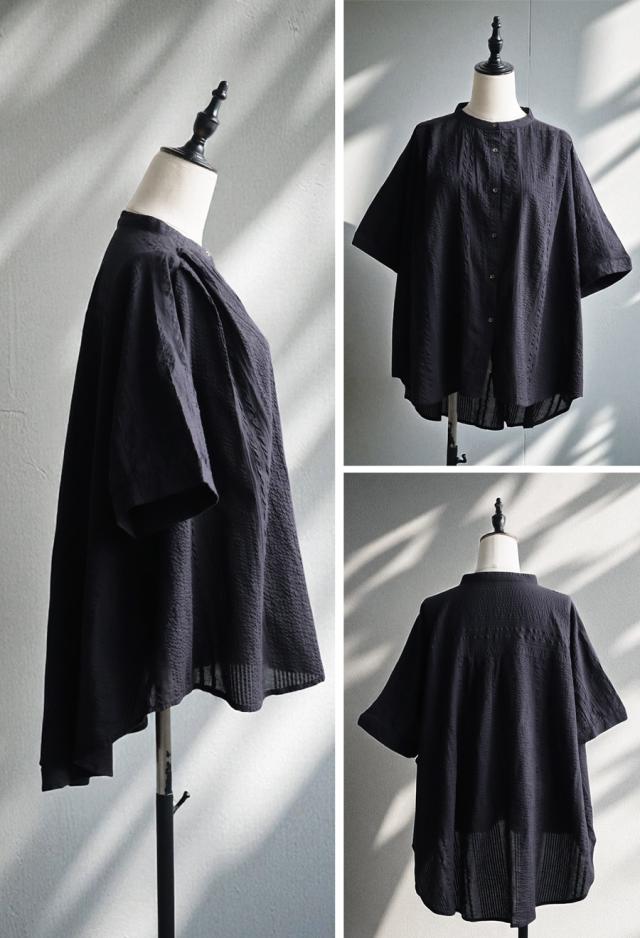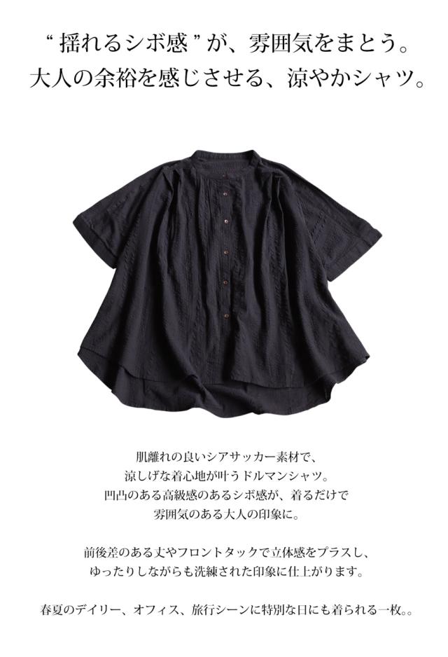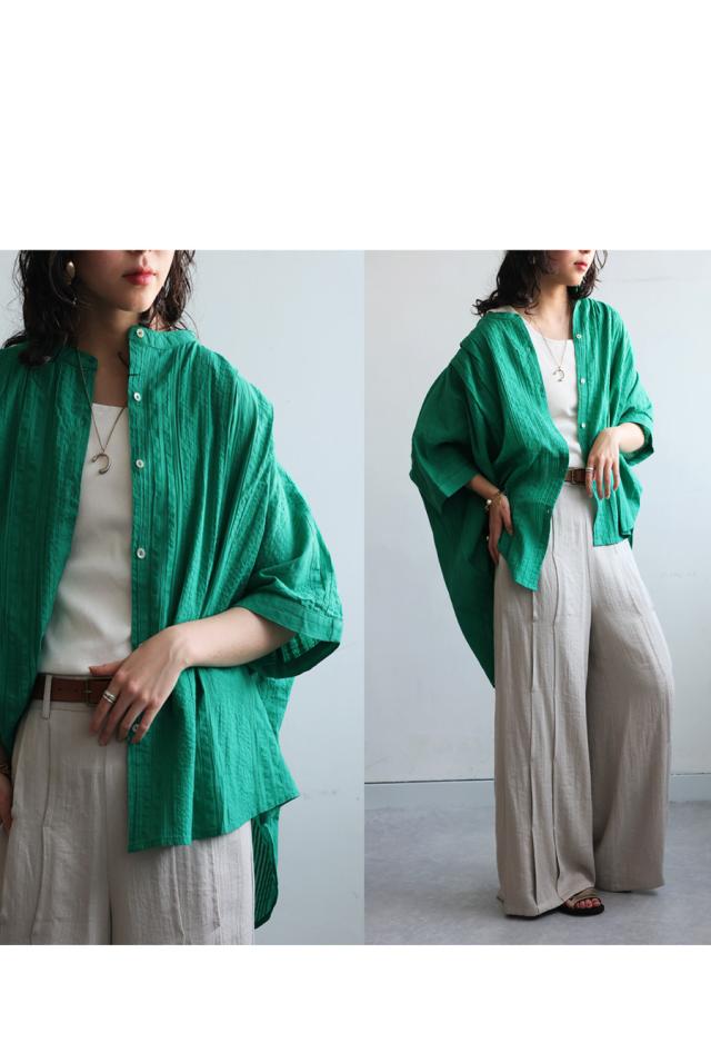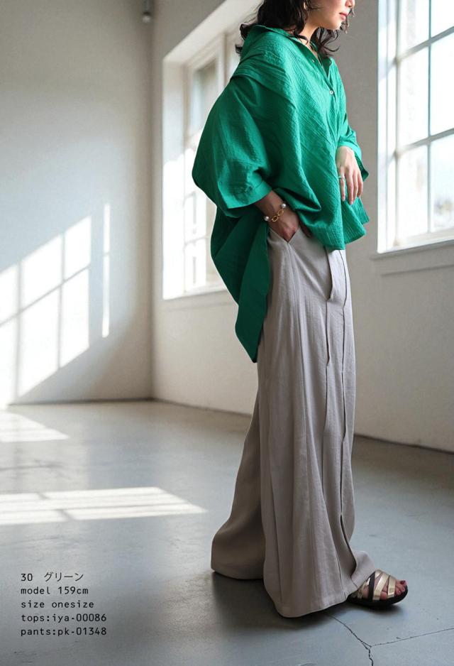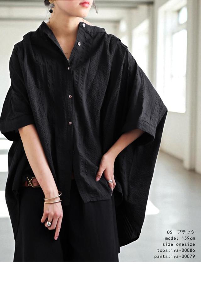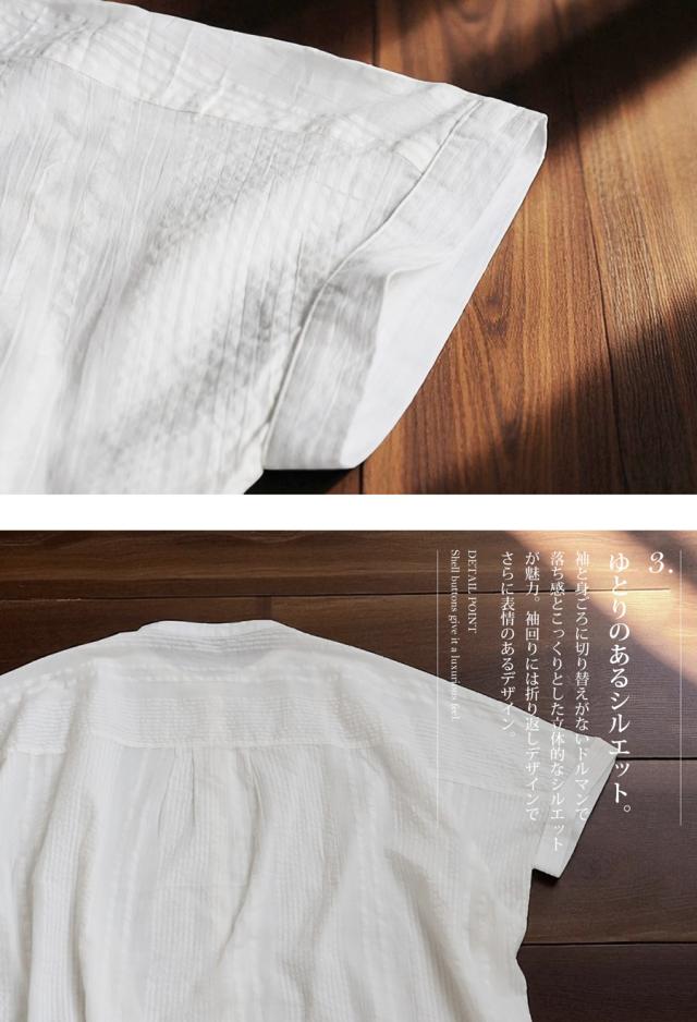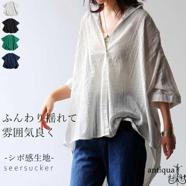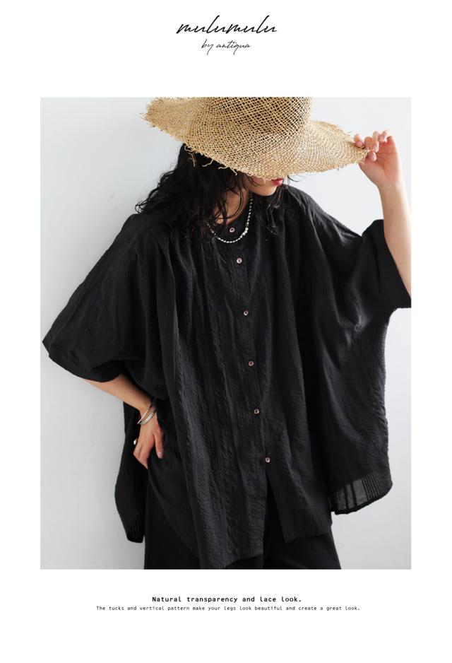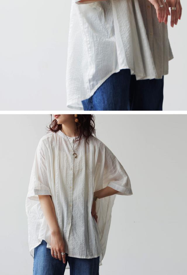 iya-00086 綿100 前後差ドルマンスリーブ 涼感 シボ感 ストライプ 凹凸 体型カバー ナチュラル ゆったり コットン 綿 前開き ボタン ブラウス 上品 シンプル 羽織