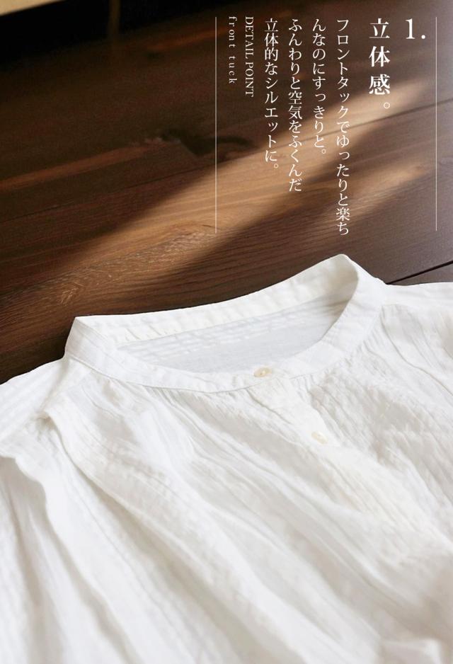 襟元はシンプルなバンドカラーで、首まわりをすっきりと見せてくれます。