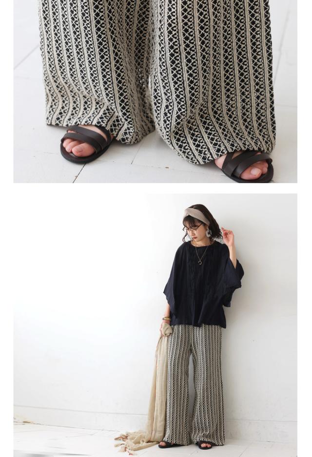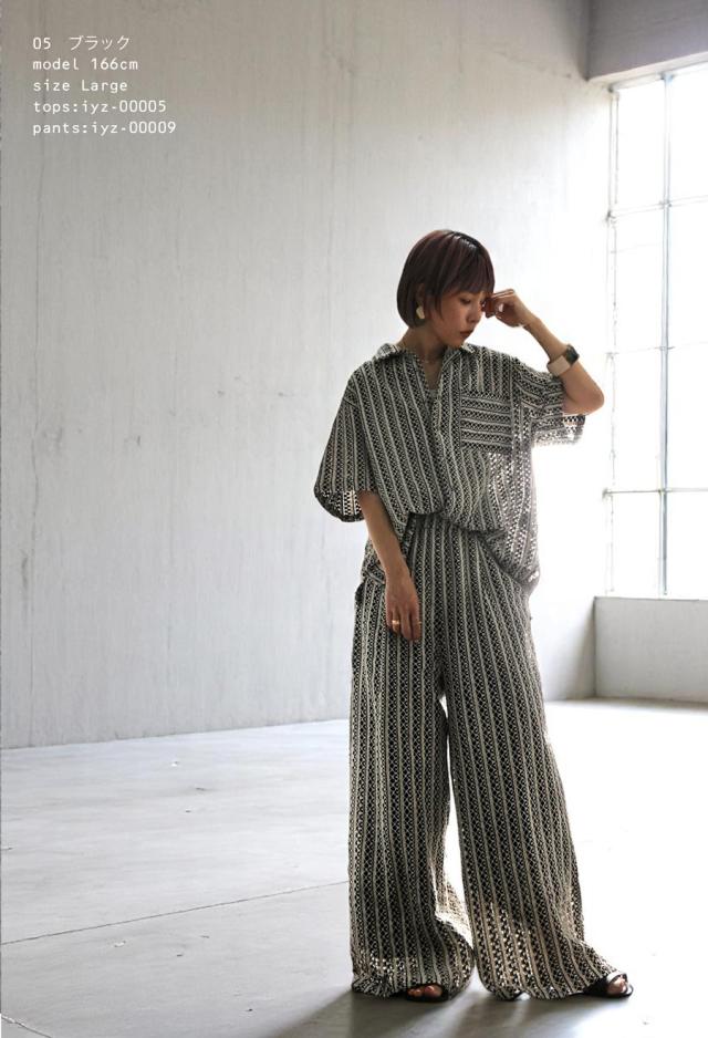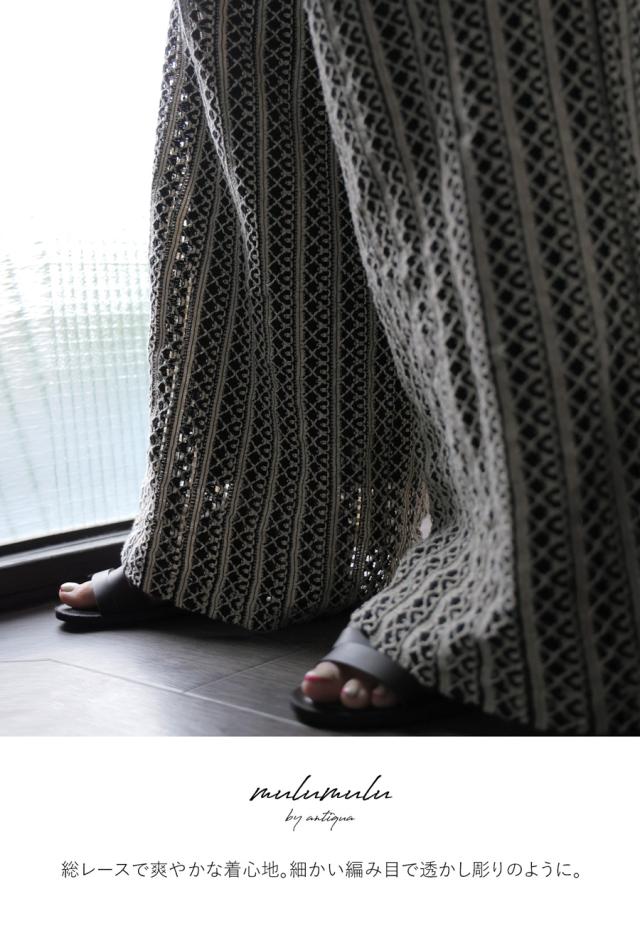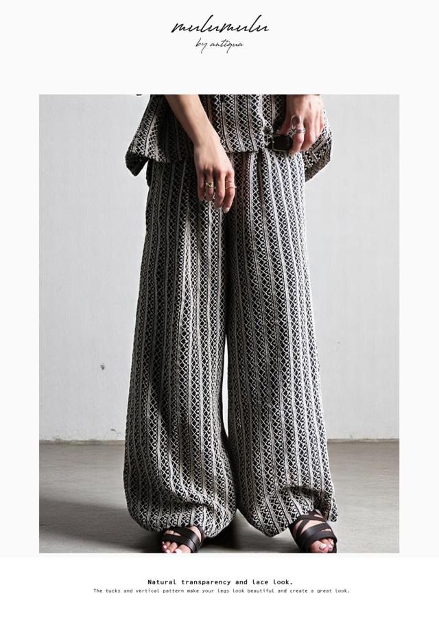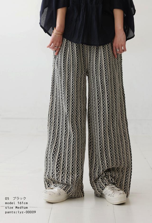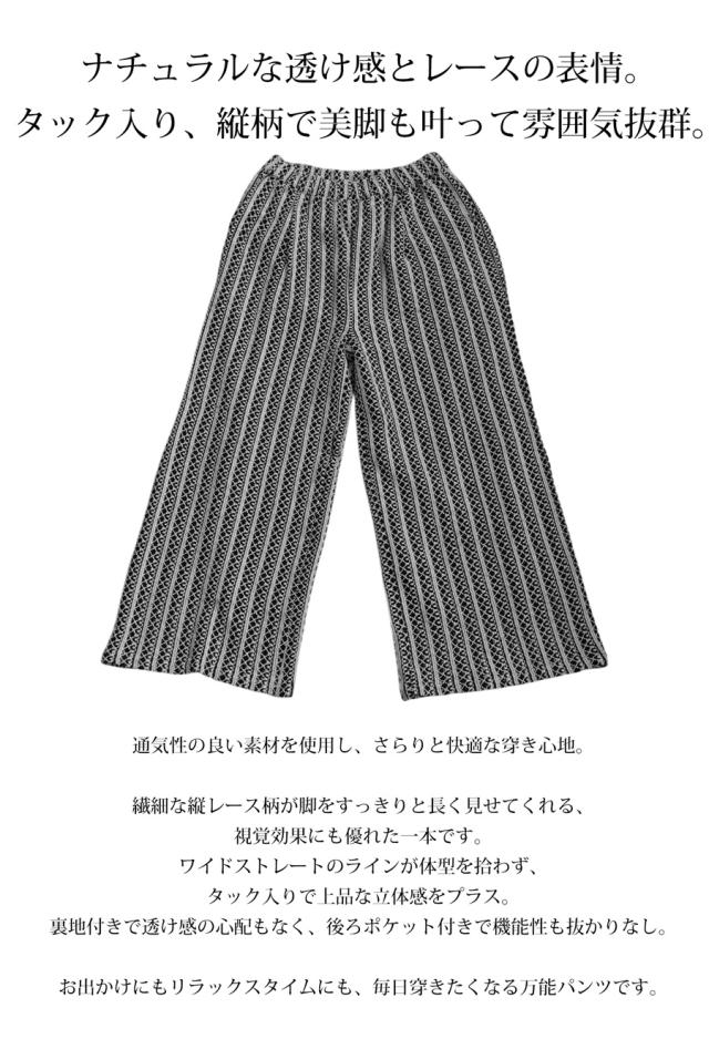 iyz-00009 柄 レース 縦軸レース ロング ゆったり ワイド ワイドシルエット ストレート ワイドストレート 総柄 落ち感 長ズボン ポケット付き 裏地付き ウエストゴム 前フラット 後ろゴム