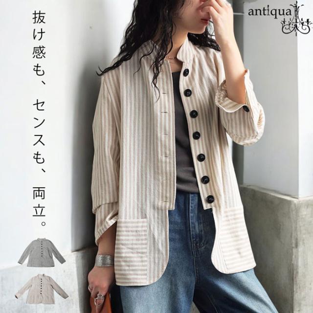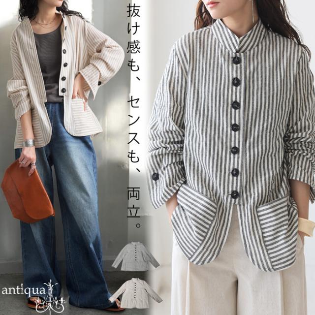 【検索ワード】ストライプデザインシャツ トップス レディース シャツ 羽織り 長袖 ストライプ柄 柄シャツ スタンドネック 柄 前開き ボタン フロントボタン サイドポケット ポケット付き 綿100 綿 コットン 前立て ゆったり カジュアル ラフ モード スタイリッシュ モダン 体型カバー 細見え 着痩せ 大きめ 大きいサイズ 軽アウター ライトアウター ナチュラル ブラック 黒 antiqua アンティカ 大人 おしゃれ 10代 20代 30代 40代 50代 60代 春 夏 秋 お洒落 カジュアル かわいい かっこいい あんてぃか