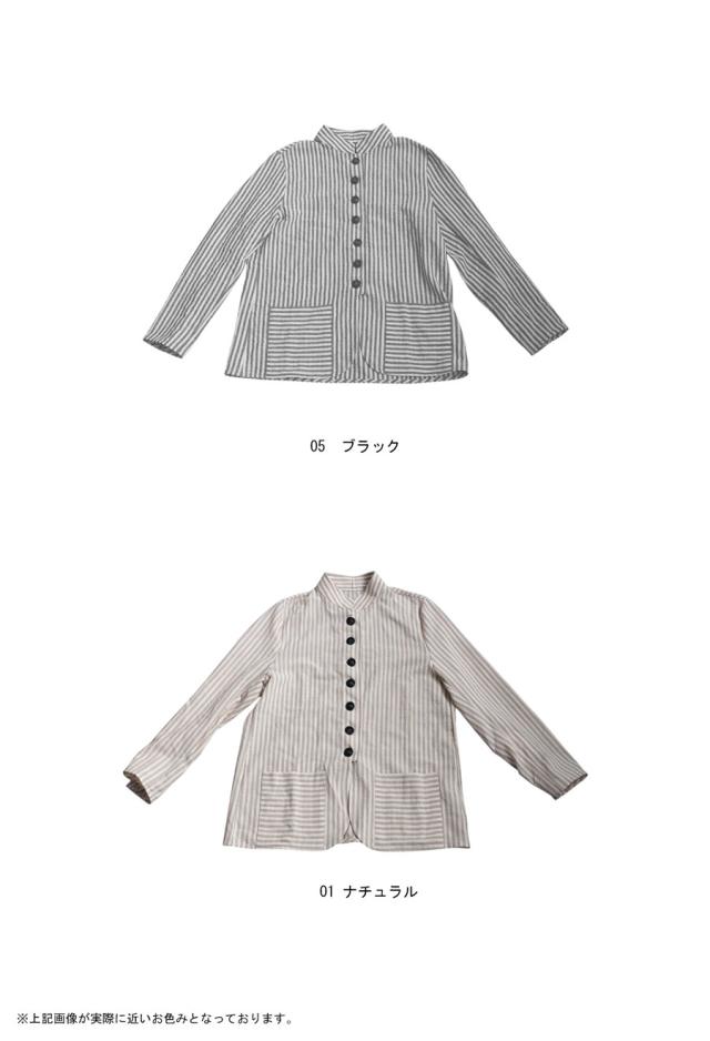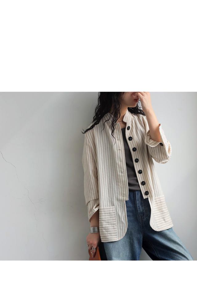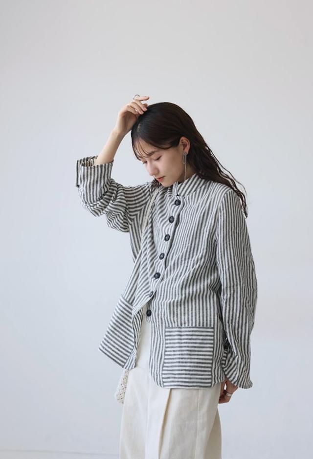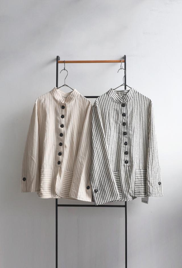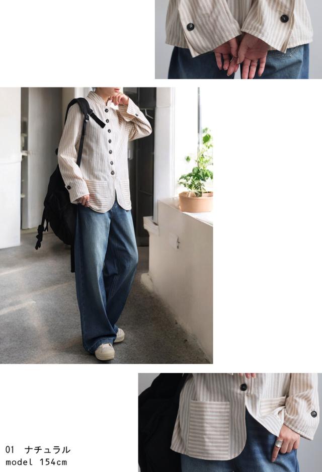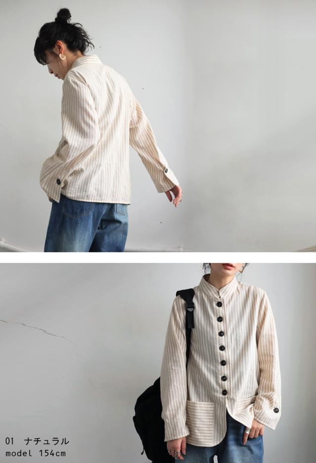 pa-03793 羽織り 長袖 ストライプ柄 柄シャツ スタンドネック 柄 前開き ボタン ポケット付き 綿100 綿 コットン ゆったり カジュアル ラフ モード スタイリッシュ モダン