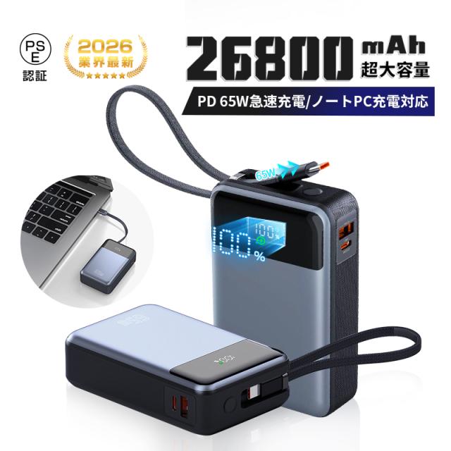 2026年新開発 モバイルバッテリー 26800mAh パワーバンク 軽量 超小型 Type-C出入力 LCD残量表示 USBポート android apple watch/Android PD65W 持ち運び便利 指紋防止 ストラップ付き 防災アイテム 停電対策 安全保護 iPhone17/iPhoneAir対応 【PL保険加入済み製品・安心】