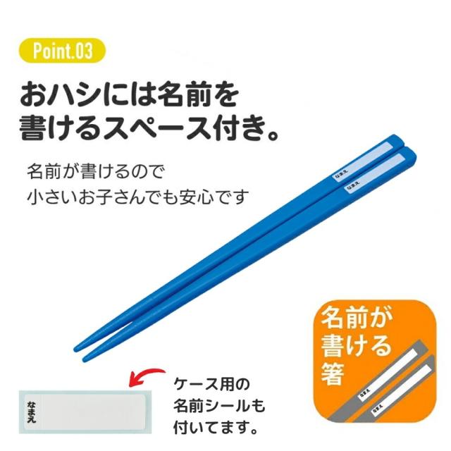 お箸には名前を書けるスペースがあり、ケース用の名前シールも付属しているので、保育園や幼稚園、小学校での使用に最適です。