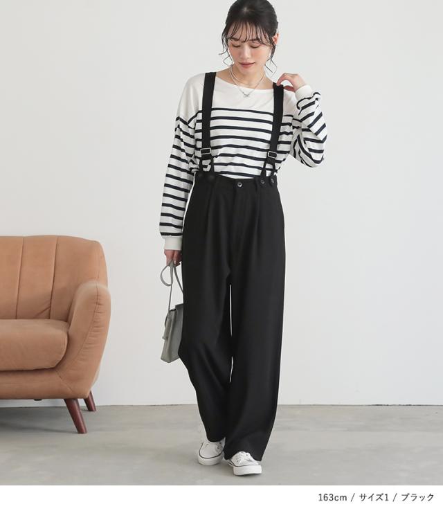 | staff:L/162.5cm B83 W63 H87 【普段着用】 Tops: M Bottoms: M/L | 【1】 着丈(ウエスト穿き):かかと上1cm位 ウエスト:ややゆったり ヒップ:ゆったり 太もも周り:ゆったり 全体:スッキリ すっきりとしたシルエットで穿けました!サスペンダーをつけて着用するとハイウェストになり可愛かったです。 【2】 着丈(ウエスト穿き):かかとから3cm余る位 ウエスト:大きい ヒップ:大きい 太もも周り:大きい 全体:大きい ウエストに余裕があり大きかったです。 私の場合は、1を選びます。 |