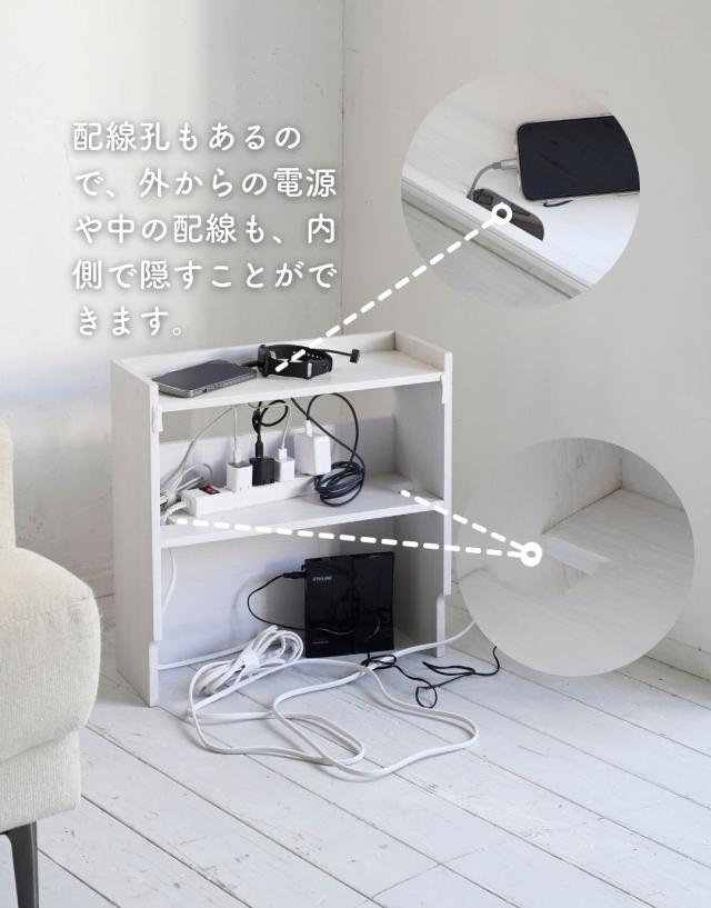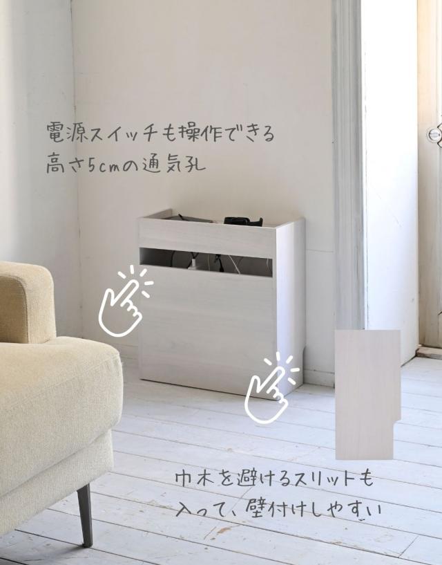 | 商品説明 | ●完成品でお届け ※手作りのため、研磨の精度や細部の塗装には個体差がございますので、見本写真をご参照の上、予めご了承ください。 ●タップやルーターをすっきり隠せる、ケーブル収納ボックス ●内側が放熱しやすいオープン仕様 ●巾木カットされているので、壁に付けてすっきり隠す収納 ●内側には固定棚が1段あり、電源タップを収納可能 ●外側には、電源タップのON/OFF操作にうれしいスリット窓付き ●中棚両端にも配線孔があり、内部でコード通し可能 ●スリット入りの天板で、ケーブルを出して充電可能 ●天板は固定式 ●天板内寸:幅40.5 奥行15 こぼれ止め高さ2.5cm ●中棚内寸:幅40.5 奥行15 高さ17cm ●中棚下内寸:幅40.5 奥行15 高さ22.5cm ●スリット窓:よこ40.5 たて5cm、中棚からの高さ8.5cm ●天板スリット: 約2×8cm ●中棚コード孔: 約4×4cm ●内側も塗装あり(底面は無塗装) ●巾木カット: 約2×9.5cm |
