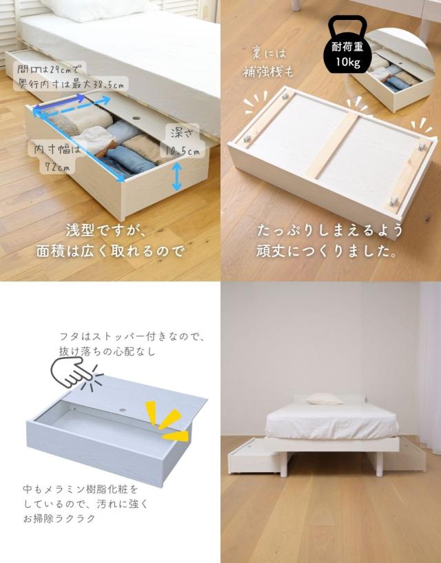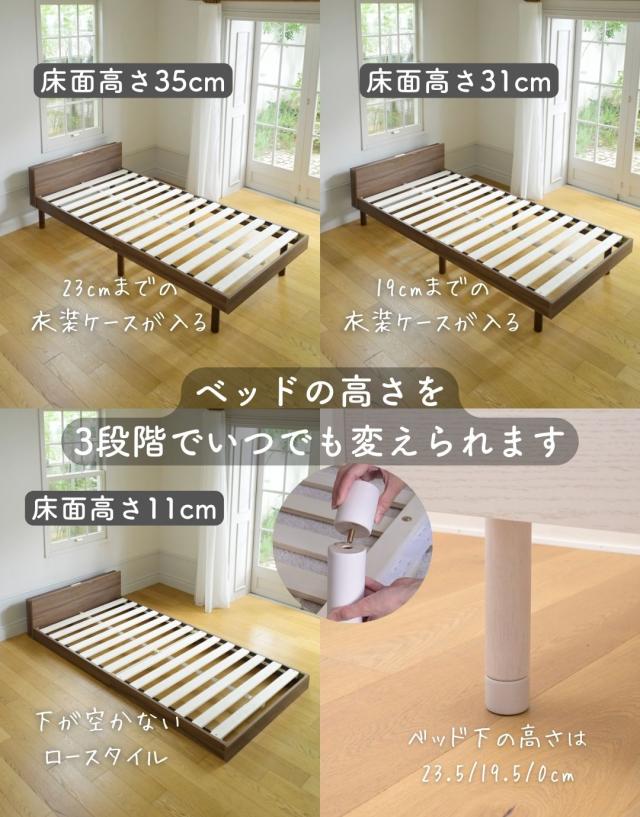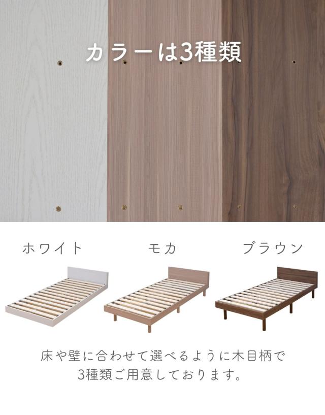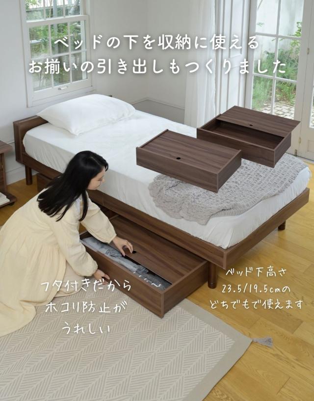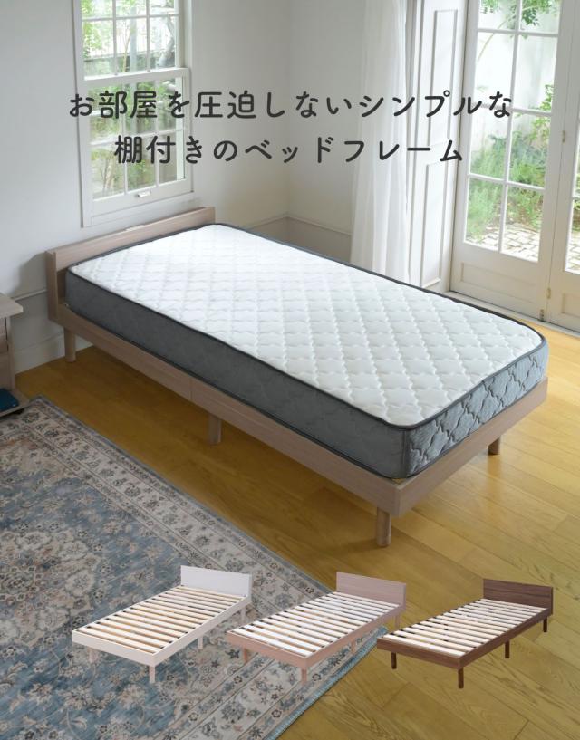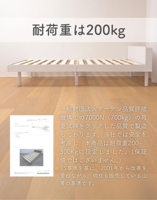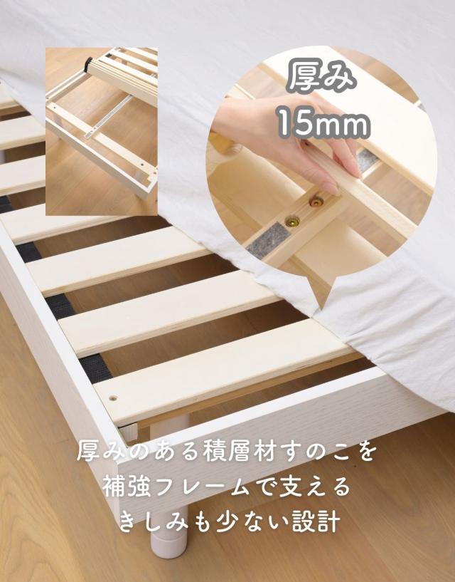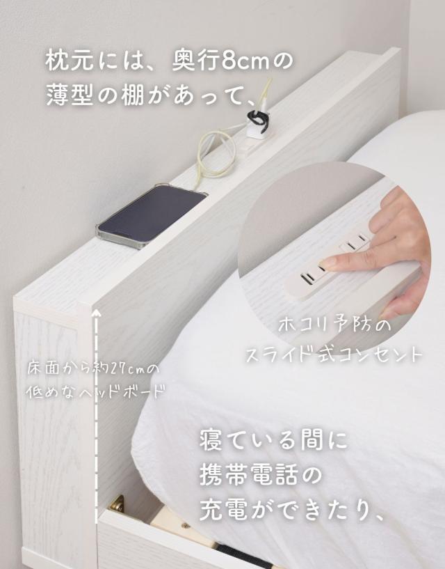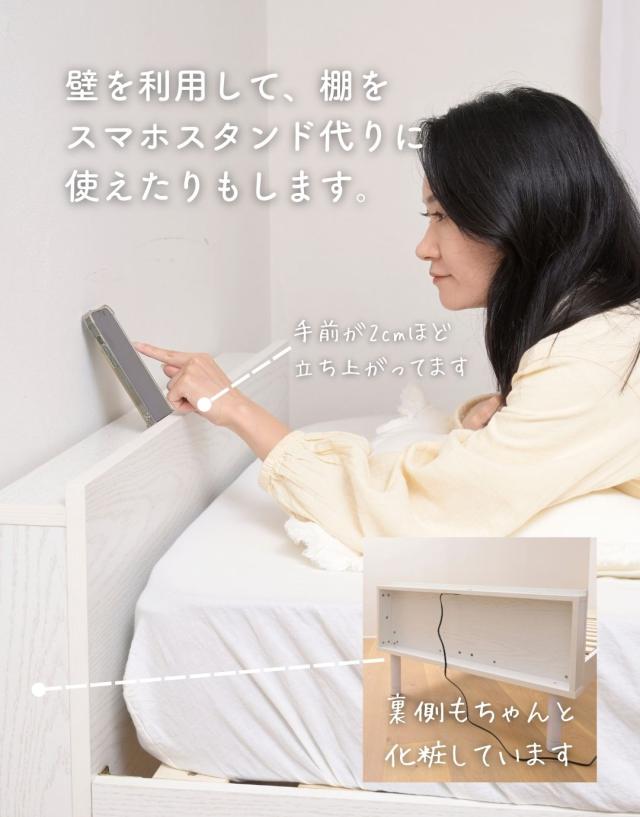 | 商品説明 | ●ベッドフレームは2梱包で重たい荷姿で玄関先までのお届けとなります。搬入、組み立て、設置はお二人以上での作業がおすすめです。 ●プラスドライバーをご用意ください。六角レンチは付属あり。 ●薄型の棚付きヘッドボードのシングルベッド ●棚には2口コンセントが付いていて、枕元でスマホの充電が可能 ●棚は手前がこぼれ止めになっているので、壁に立てかければスタンドとしても活躍 ●棚内寸: 幅97 奥行8cm (中央に11×2cmのコンセントあり) ●こぼれ止め立ち上がり: 2cm ●2口コンセント、合計1500Wまで、コード長さ1.7m ●コンセントは棚のほぼ中央に配置 ●ホコリガードのフタ付きコンセント ●床面の高さは3段階で変更可能: 11/31/35cm ●ローベッドから、収納に使える高さまで、脚をネジって付け替え可能 ●ベッド下サイズ: 高さ0/19.5/23.5 幅79cm ●脚部側の脚〜脚内寸: 76cm ●【床面高さ31、35cm時】ロボット掃除機も入ってベッド下の掃除もしやすい、床下貫通設計 ●【床面高さ31、35cm時】ベッド下には衣装ケースも置いて収納スペースとしても活躍 ●床面は厚み15mmのある積層材すのこを、補強フレームで支える、きしみも少ない頑丈設計 ●静止耐荷重: 200kg ※本製品は最大荷重試験の7000N(約700Kg)をクリアした商品です。当社では安全を考慮し、本商品はシングルベッド利用時は耐荷重200Kgに設定しております。耐荷重は保証値ではございません。 ●床面サイズ: 幅97 長さ195cm ●すのこ隙間: 約6cm ●フレームやヘッドボードには、湿気や傷に強い、メラミン樹脂化粧の素材を使用 ●脚部裏に貼り付けるフェルトシール付属 |