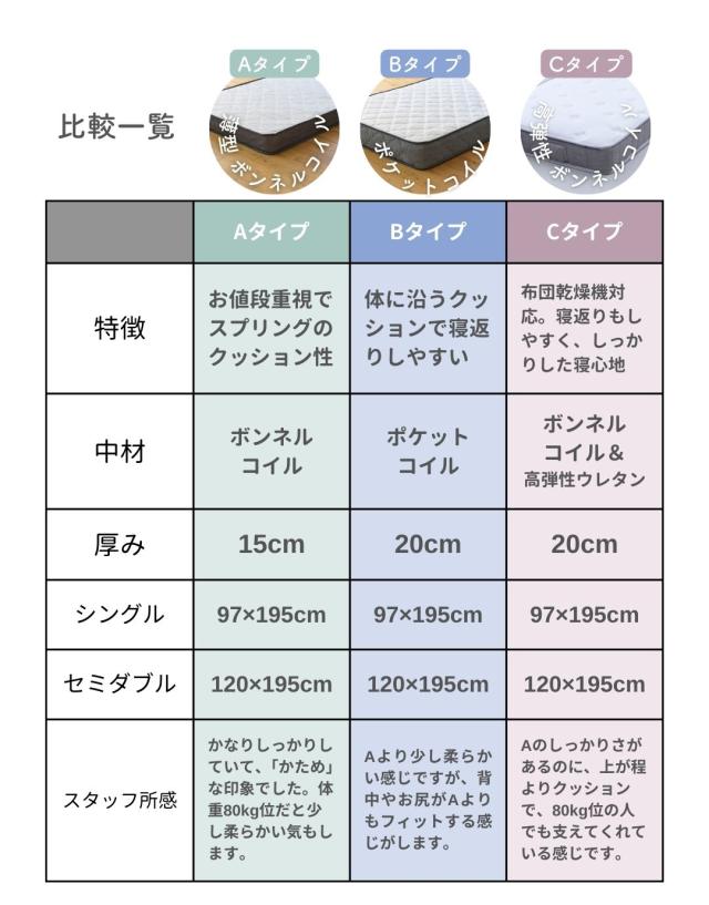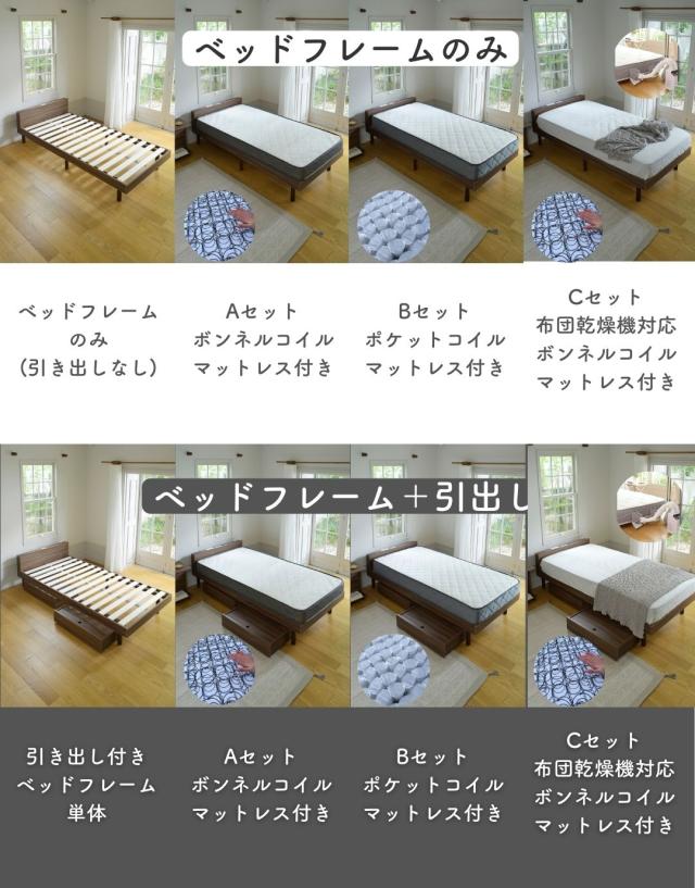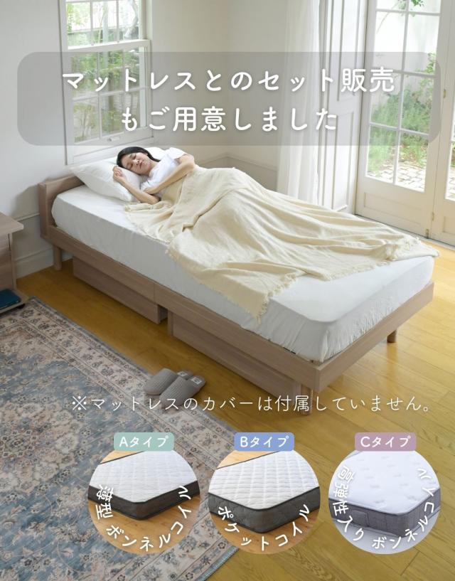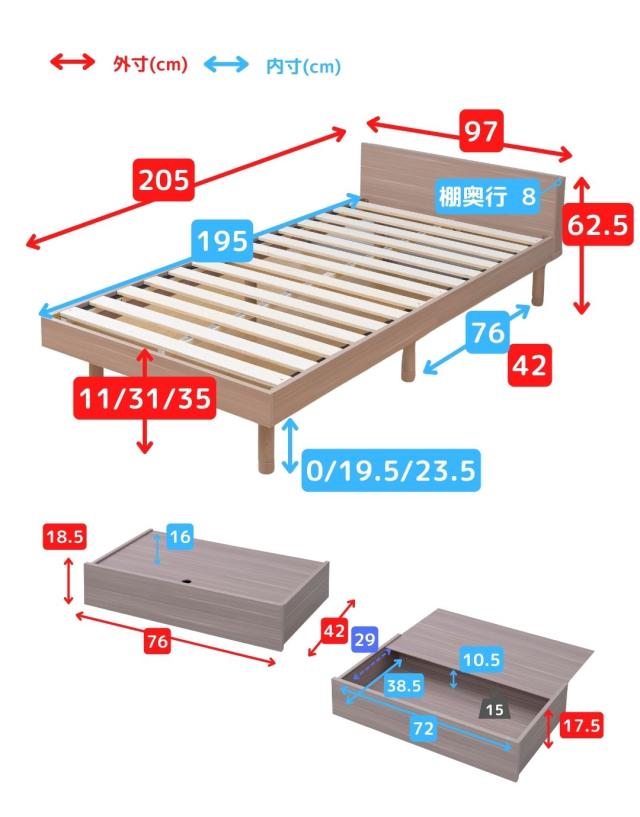 | 本体サイズ | ▼フレーム 幅97×長さ205×高さ62.5cm 重量29kg ▼マットレスB_ポケットコイル 幅97×長さ195×厚さ20cm 重量16kg |
