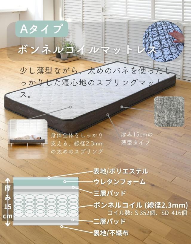 | 材質 | ▼フレーム 本体: 合成樹脂化粧繊維板(メラミン樹脂) 床面: 積層材(無塗装) 脚部: 天然木(ラッカー塗装) ▼マットレス 張地: ポリエステル100% (A/Bの裏地は不織布) 中材: コイルスプリング、ウレタンフォーム、フェルト(ポリエステル) |