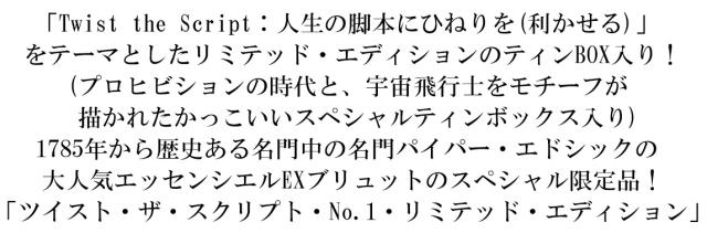 「Twist the Script:人生の脚本にひねりを(利かせる)」 をテーマとしたリミテッド・エディションのティンBOX入り! (プロヒビションの時代と、宇宙飛行士をモチーフが 描かれたかっこいいスペシャルティンボックス入り) 1785年から歴史ある名門中の名門パイパー・エドシックの 大人気エッセンシエルEXブリュットのスペシャル限定品! 「ツイスト・ザ・スクリプト・No.1・リミテッド・エディション」