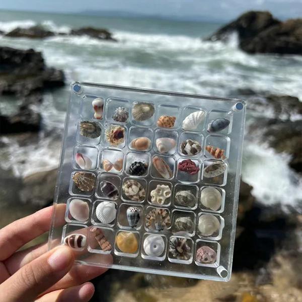 透明な四角いシェル収納ボックス、ミニストーン標本、海辺のディスプレイ、1個