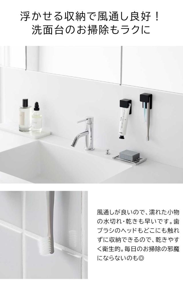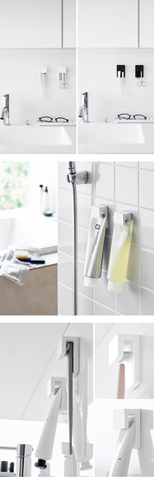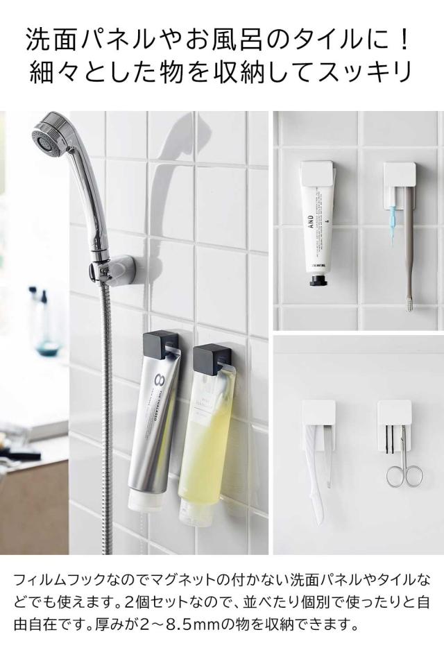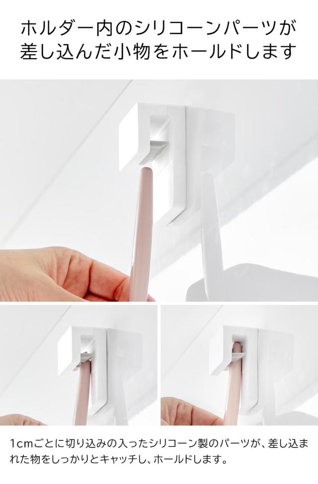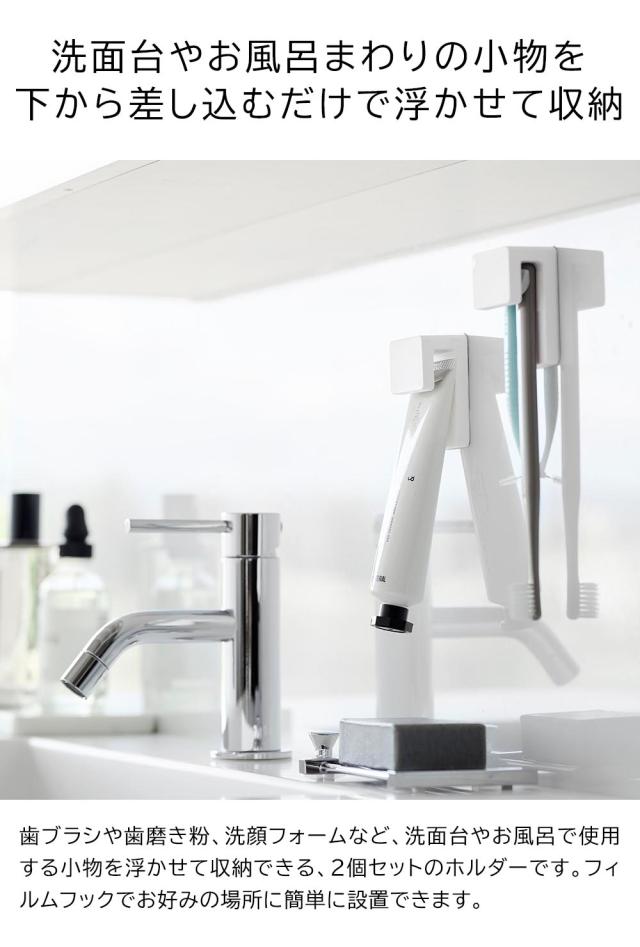 歯ブラシや歯磨き粉、洗顔フォームなどの小物を浮かせて収納できる、2個セットのホルダーです。フィルムフックで洗面パネルやお風呂のタイルなどのお好みの位置に簡単に設置できます。収納したい物を下からスッと差し込むだけで、ホルダー内部にある切り込みの入ったシリコーンパーツがしっかりとホールドします。浮かせて収納できるので風通しも良好!濡れた歯ブラシのヘッドも、下向きにしてどこにも触れることなく収納できるので、乾きやすく衛生的です。厚みが2〜8.5mmの物であれば収納できるので、歯間ブラシやピンセットのような小さな物も収納可能です。浮かせているので場所を取らず、周辺のお掃除の際にも邪魔にならず快適です。
