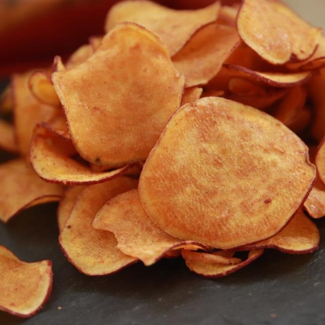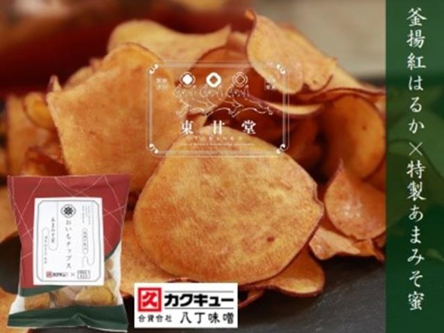 熟成した紅はるかを昔ながらの釜揚製法でパリッと揚げた歯触りのよいチップスに、カクキュー伝統の長期熟成味噌をおいもチップスに合わせて独自ブレンドしたあまみそ蜜をかけたチップスです。