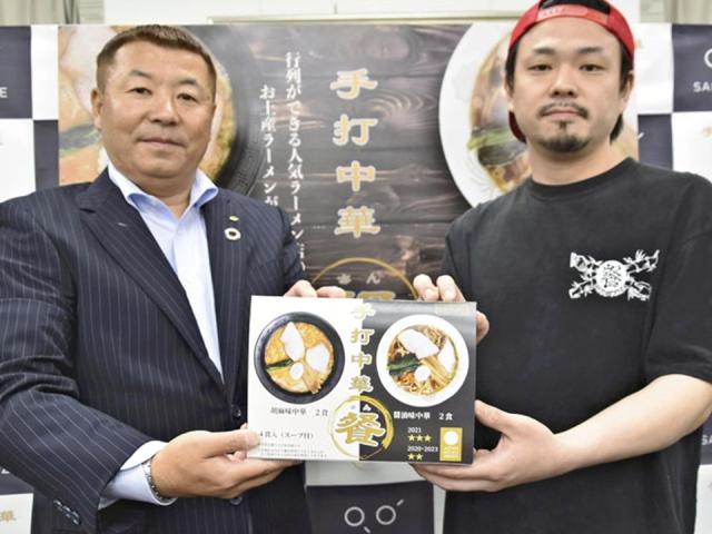 (写真はお土産ラーメンをPRする地域商社SAKURAIZE野本理事長(左)と店主畠山さん)